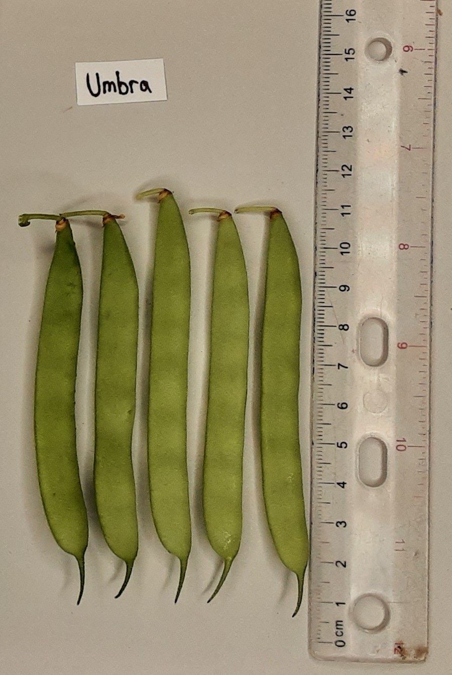 Summary: The plants of Umbra' are taller than those of Zorro'. At full flowering, the upper side of the leaf of Umbra' is dark to very dark green while that of OAC Vortex' is medium green and that of Zorro' is medium to dark green. The plants of Umbra' flower later than those of the reference varieties. Stringiness of the ventral suture is present on the pod of Umbra' while it is absent on the pods of the reference varieties. The pod of Umbra' has absent or very weak curvature while the pod of OAC Vortex' has a weak concave curvature. The beak on the pod of 'Umbra' is longer than that of OAC Vortex'. The seed weight of 'Umbra' is less than that of OAC Vortex' and greater than that of Zorro'.