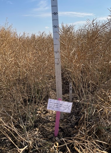 Tests & Trials: The comparative trials for G00012BC' were conducted during the 2022 and 2023 growing seasons in Saskatoon, Saskatchewan. The trial included 3 replicates. The candidate and reference variety were sown side by side in the first replicate whereas varieties in the second and third replicate were completely randomized. The plots consisted of 2 rows that were 3 metres in length with spacing of 50 cm between rows. The planting density of 26 seeds per metre resulted in a total of 468 plants per variety per year. The measured characteristics were based on 30 measurements per variety per year except for silique characteristics which were based on 60 measurements per variety per year. Mean differences were significant at the 2% probability level based on LSD values.