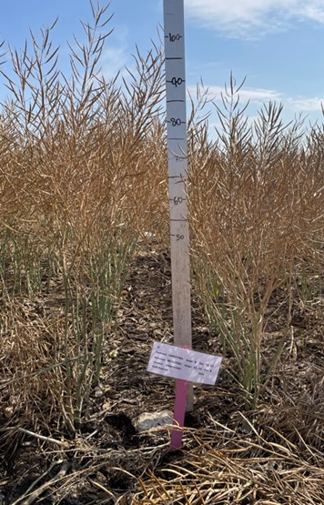 Tests & Trials: The comparative trials for 4PNRM27R' were conducted during the 2022 and 2023 growing seasons in Saskatoon, Saskatchewan. The trial included 3 replicates. The candidate and reference variety were sown side by side in the first replicate whereas varieties in the second and third replicate were completely randomized. The plots consisted of 2 rows that were 3 metres in length with spacing of 50 cm between rows. The planting density of 26 seeds per metre resulted in a total of 468 plants per variety per year. The measured characteristics were based on 30 measurements per variety per year except for silique characteristics which were based on 60 measurements per variety per year. Mean differences were significant at the 2% probability level based on LSD values.