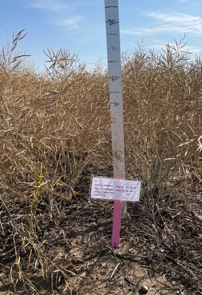 Tests & Trials: The comparative trials for 4PYYM82B' were conducted during the 2022 and 2023 growing seasons in Saskatoon, Saskatchewan. The trial included 3 replicates. The candidate and reference variety were sown side by side in the first replicate whereas varieties in the second and third replicate were completely randomized. The plots consisted of 2 rows that were 3 metres in length with spacing of 50 cm between rows. The planting density of 26 seeds per metre resulted in a total of 468 plants per variety per year. The measured characteristics were based on 30 measurements per variety per year except for silique characteristics which were based on 60 measurements per variety per year. Mean differences were significant at the 2% probability level based on LSD values.