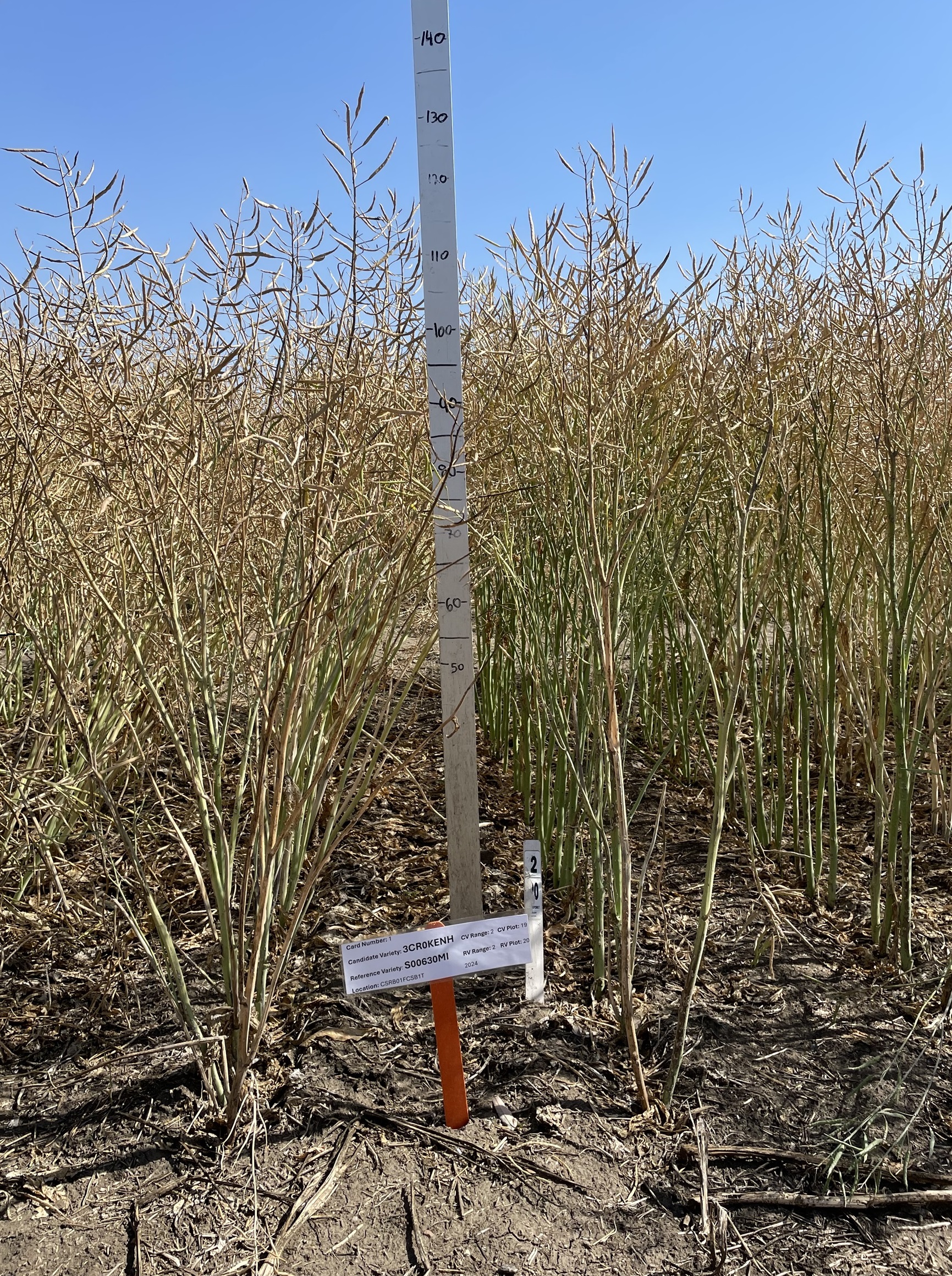 Tests & Trials: The comparative trials for 3CR0KENH' were conducted during the 2023 and 2024 growing seasons in Saskatoon, Saskatchewan. Trials were arranged in a RCB design with 3 replications per variety. The candidate and reference variety were sown side by side in the first replicate whereas varieties in the second and third replicate were completely randomized. The plots consisted of 2 rows that were 3 metres in length with spacing of 50 cm between rows. The planting density of 26 seeds per metre resulted in a total of 468 plants per variety per year. The measured characteristics were based on 30 measurements per variety per year except for silique characteristics which were based on 60 measurements per variety per year. Mean differences were significant at the 2% probability level based on LSD values.