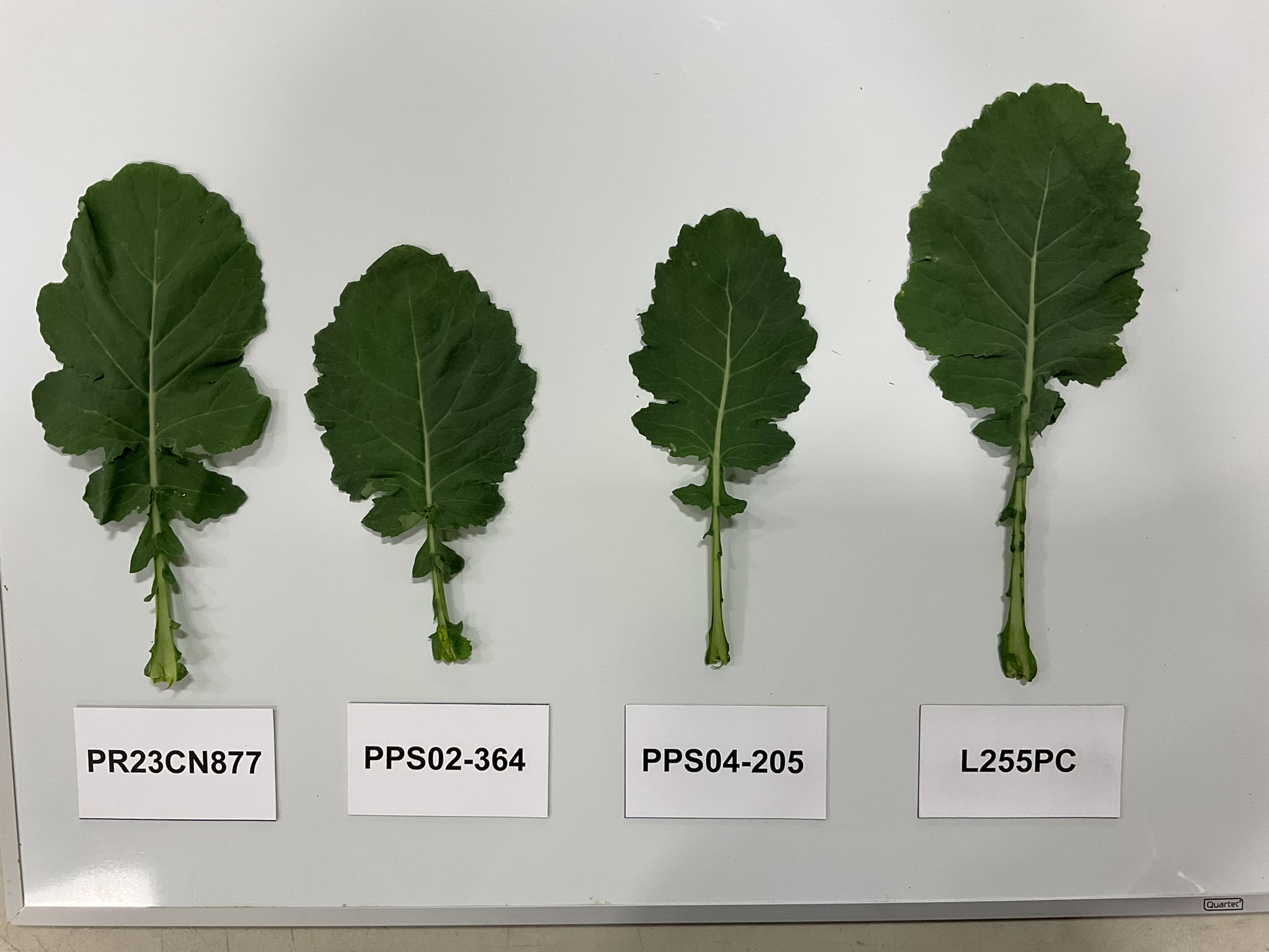 Canola: 'PR23CN877' (left) with reference varieties 'PPS02-364' (centre left), 'PPS04-205' (centre right) and 'L255PC' (right)