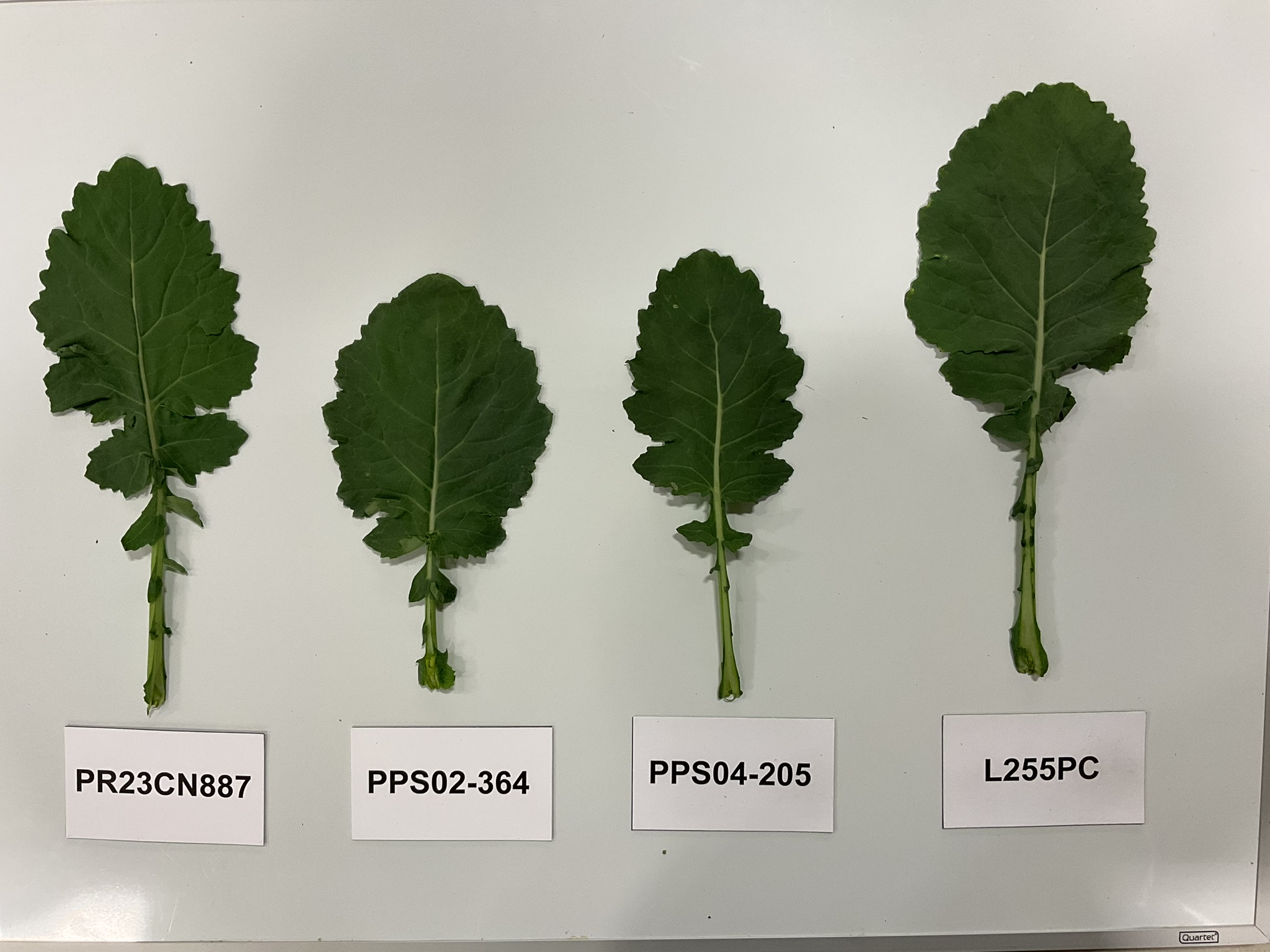 Canola: 'PR23CN887' (left) with reference varieties 'PPS02-364' (centre left), 'PPS04-205' (centre right) and 'L255PC' (right)
