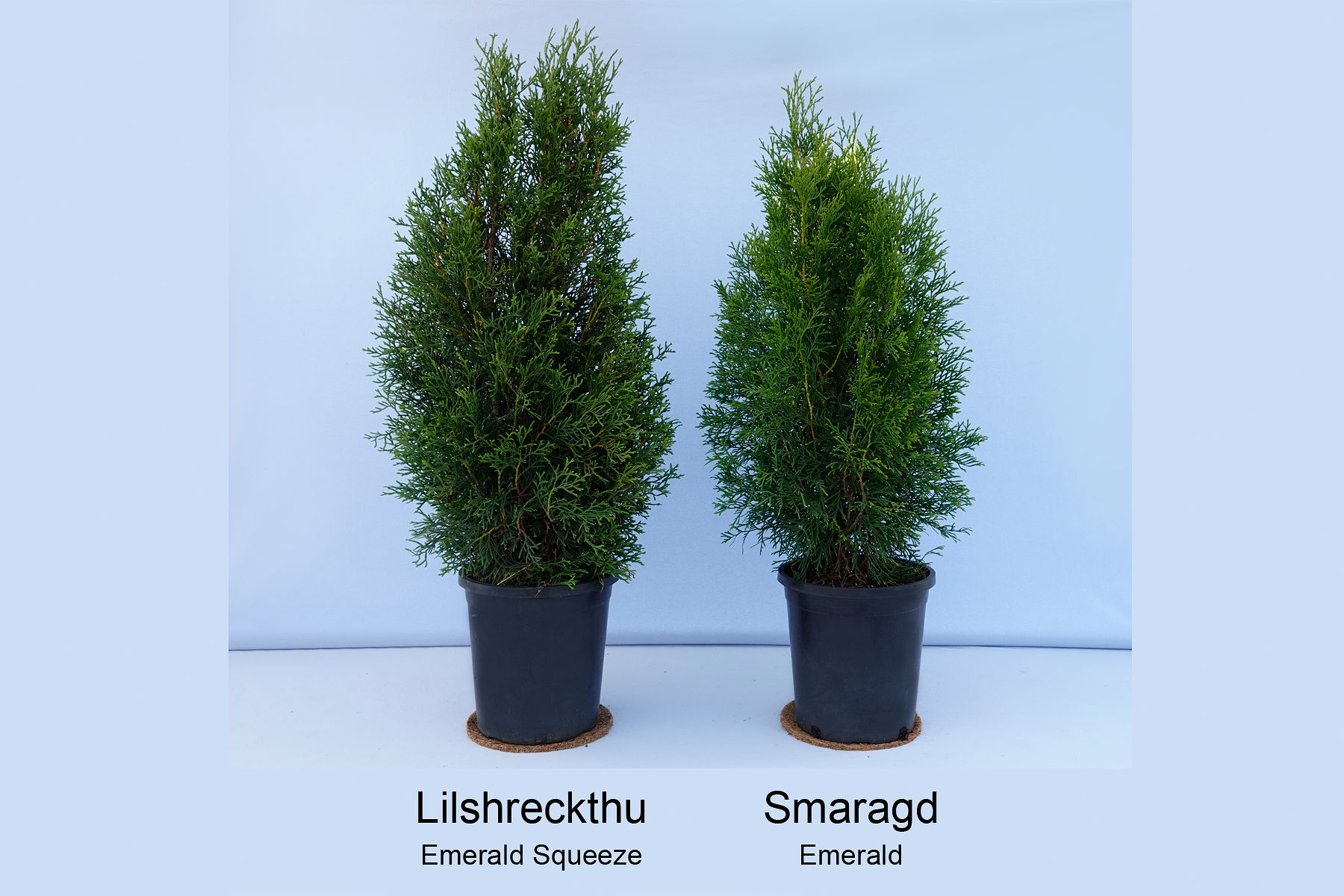 Cedar: 'Lilshreckthu' (left) with reference variety 'Smaragd' (right)