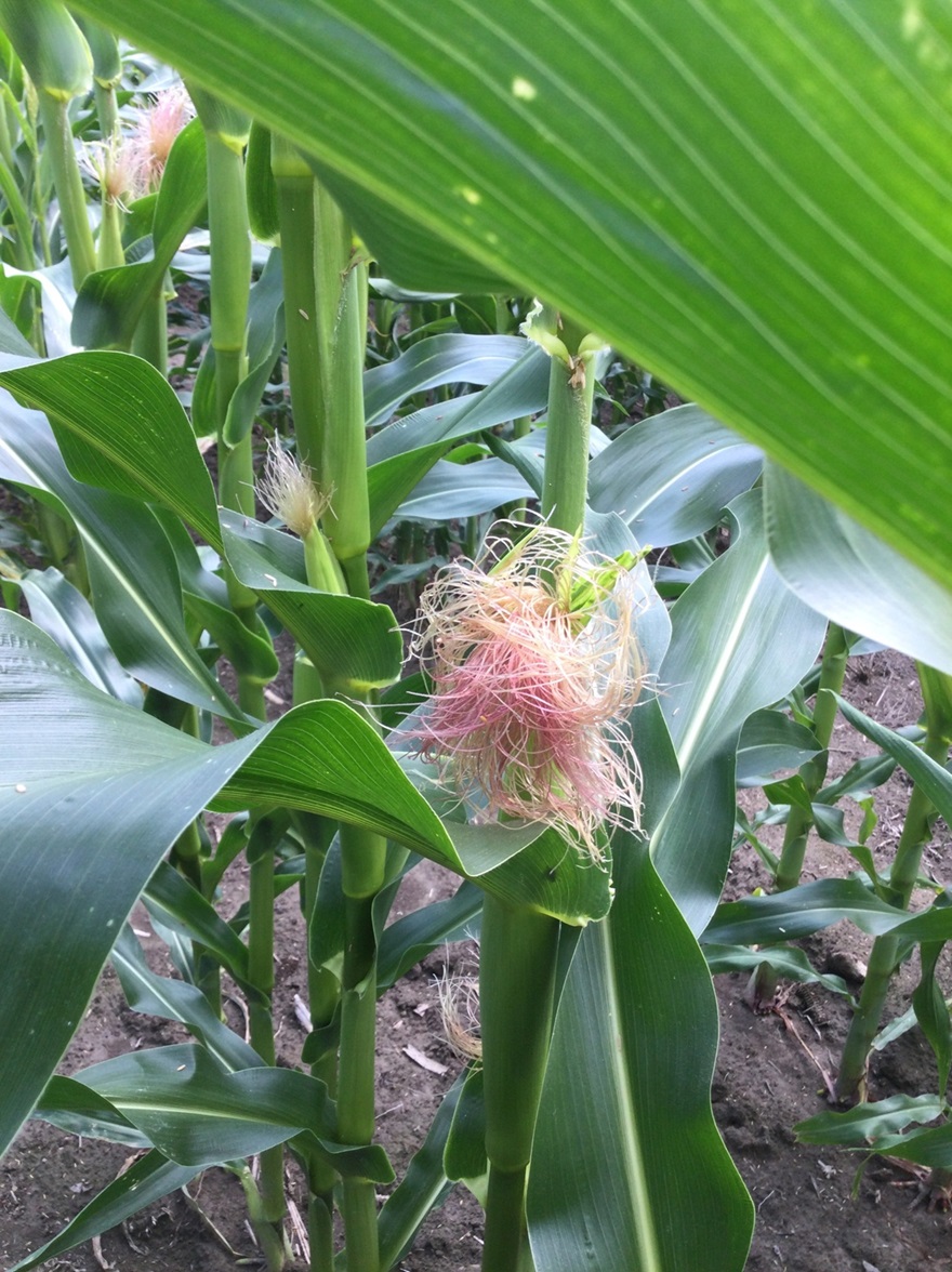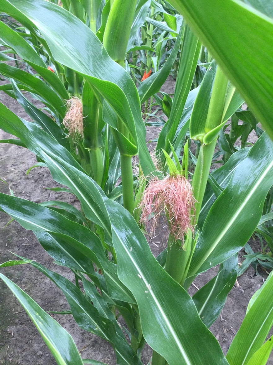 EAR: medium intensity of anthocyanin colouration of silks, conico-cylindrical shape, many rows of grain, strong intensity of anthocyanin colouration on glumes of cob