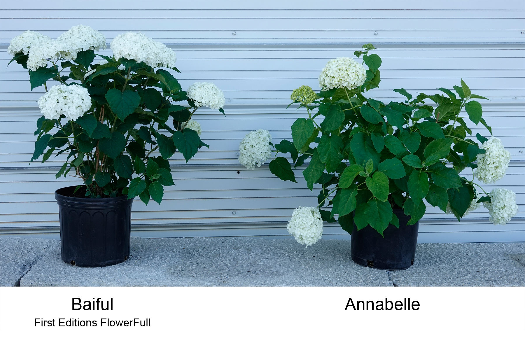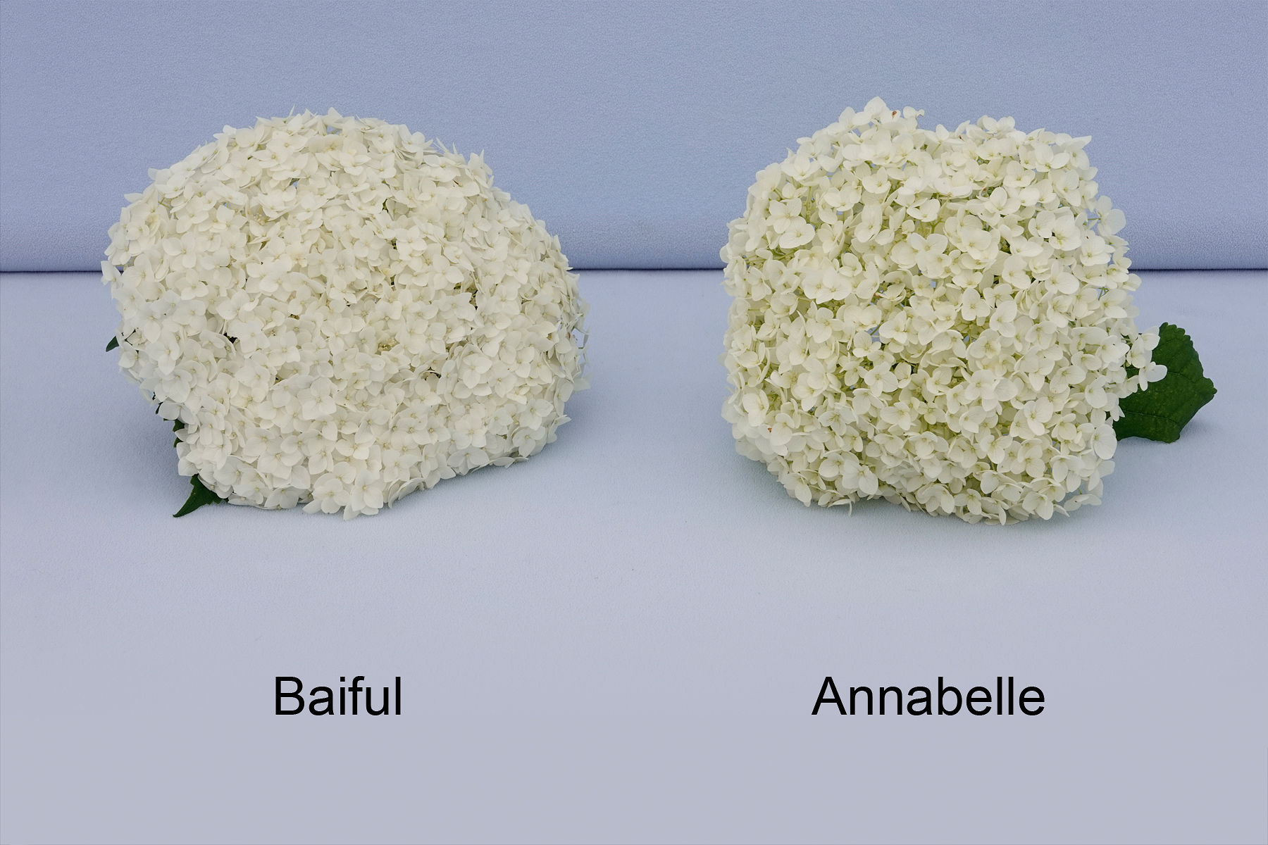 Summary: The plants of Baiful' have an upright growth habit and are taller than broad while those of Annabelle' have a semi-upright growth habit and are broader than tall. The stem of Baiful' is very strong and has absent or few lenticels while that of Annabelle' is weak and has a medium number of lenticels. The inflorescence of Baiful' is shorter and larger in diameter than that of Annabelle'.