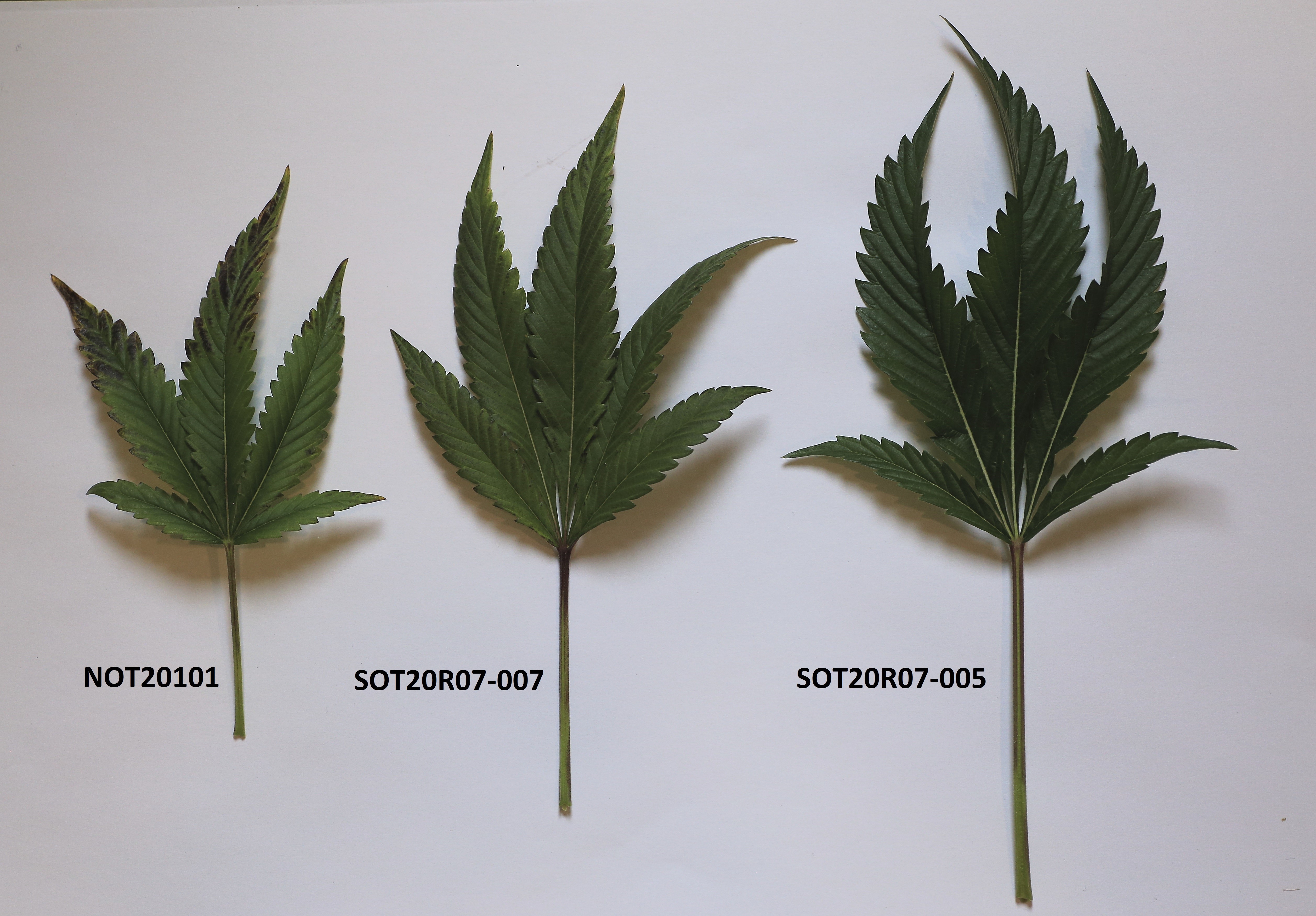 Cannabis: 'SOT20R07-005' (right) with reference varieties NOT20101' (left), and 'SOT20R07-007' (centre)