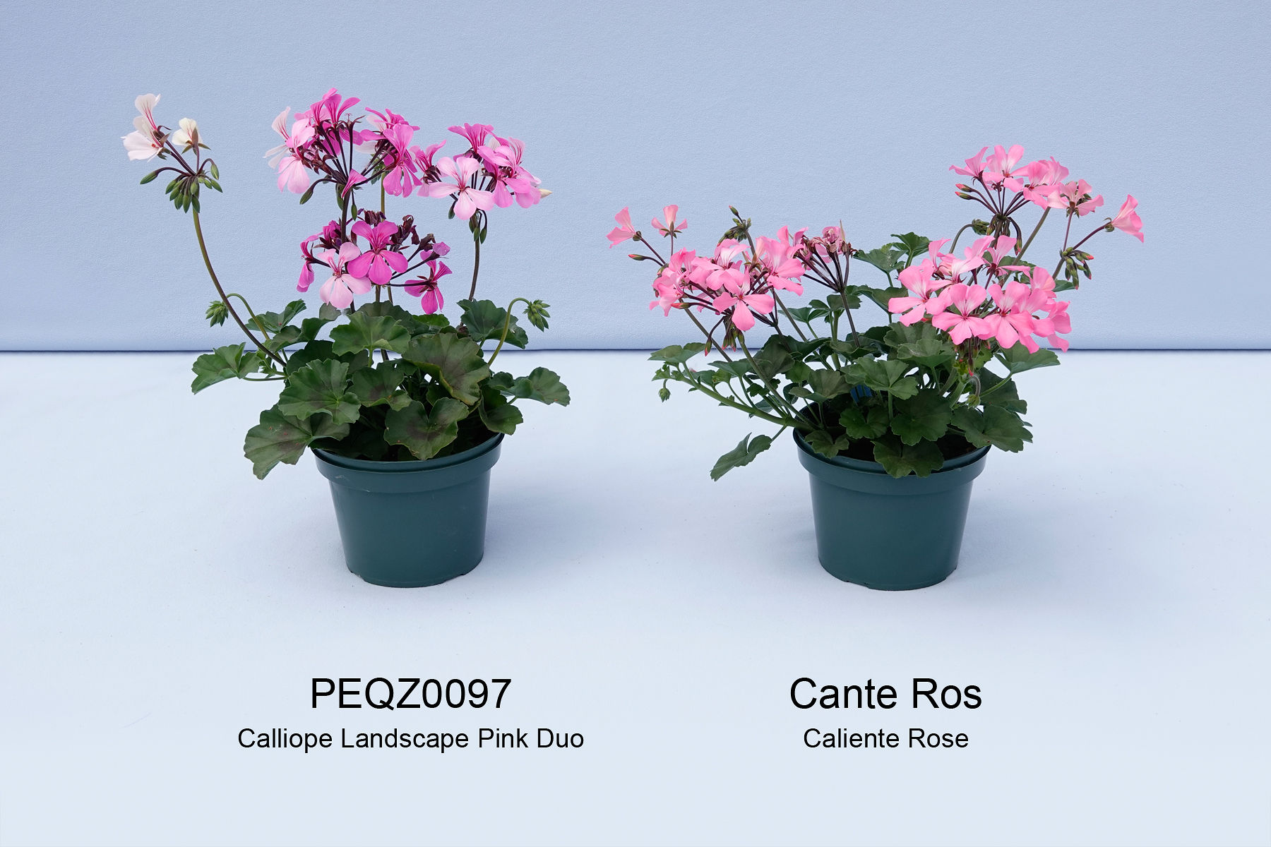 Pelargonium: 'PEQZ0097' (left) with reference variety 'Cante Ros' (right)
