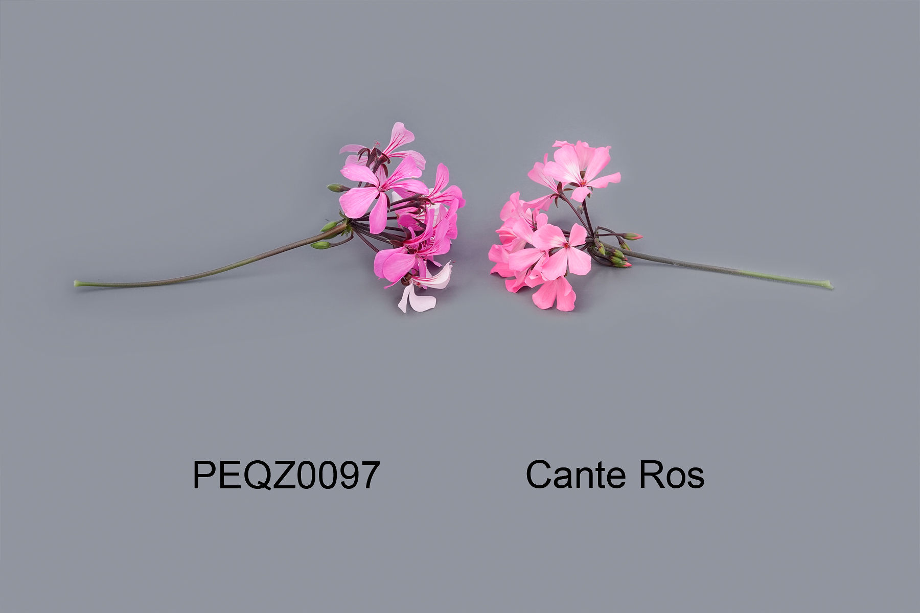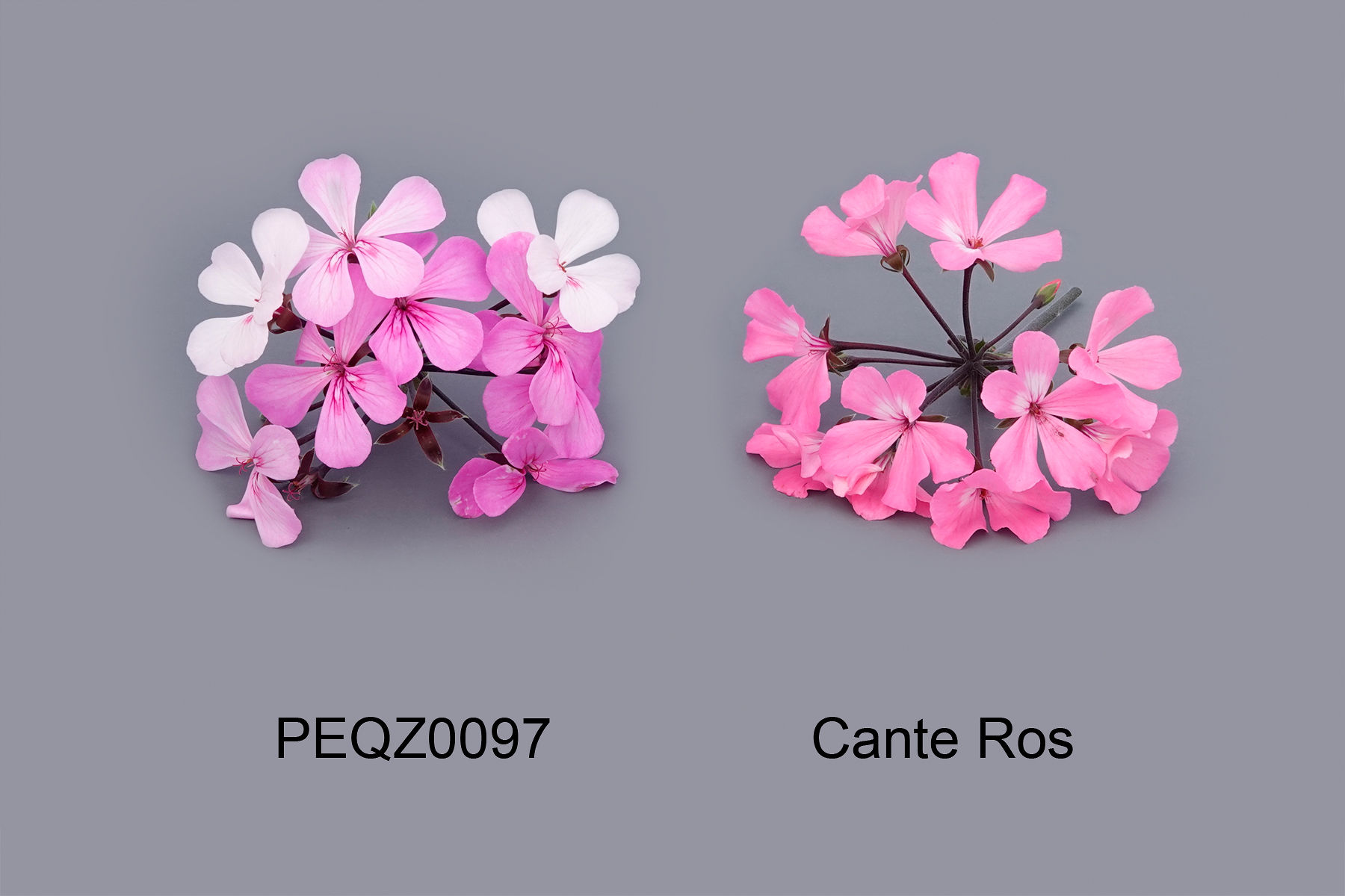 Summary: The leaf blade of 'PEQZ0097' is larger than that of Cante Ros'. The conspicuousness of the zone on the leaf blade of 'PEQZ0097' is medium to strong whereas it is weak for Cante Ros'. The inflorescence of 'PEQZ0097' is taller than that of Cante Ros'. The largest flower of the inflorescence of 'PEQZ0097' is longer than that of Cante Ros'. The margin of the inner side of the upper petal of 'PEQZ0097' is medium purple while that of Cante Ros' is medium purple red. The outer side of the upper petal of 'PEQZ0097' is medium purple while that of Cante Ros' is medium blue pink. The flower colour of 'PEQZ0097' changes from white to pink with age while that of Cante Ros' is always pink.