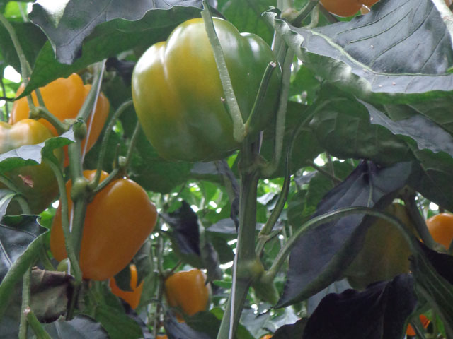 FRUIT: medium intensity of green skin before maturity, no anthocyanin colouration before maturity, drooping attitude, short to medium length, large to very large diameter, medium length to diameter ratio, square to trapezoidal shape in longitudinal section, circular shape in cross-section (at level of placenta), absent or very weak sinuation of pericarp at basal part, absent or very weak sinuation of pericarp excluding basal part, smooth or very slightly wrinkled surface, light to medium intensity of yellow skin at maturity, medium glossiness, shallow to medium depth of stalk cavity, moderately depressed apex, shallow to medium depth of interloculary grooves, equally three and four locules, medium to thick flesh, no capsaicin in placenta, early to mid season maturity