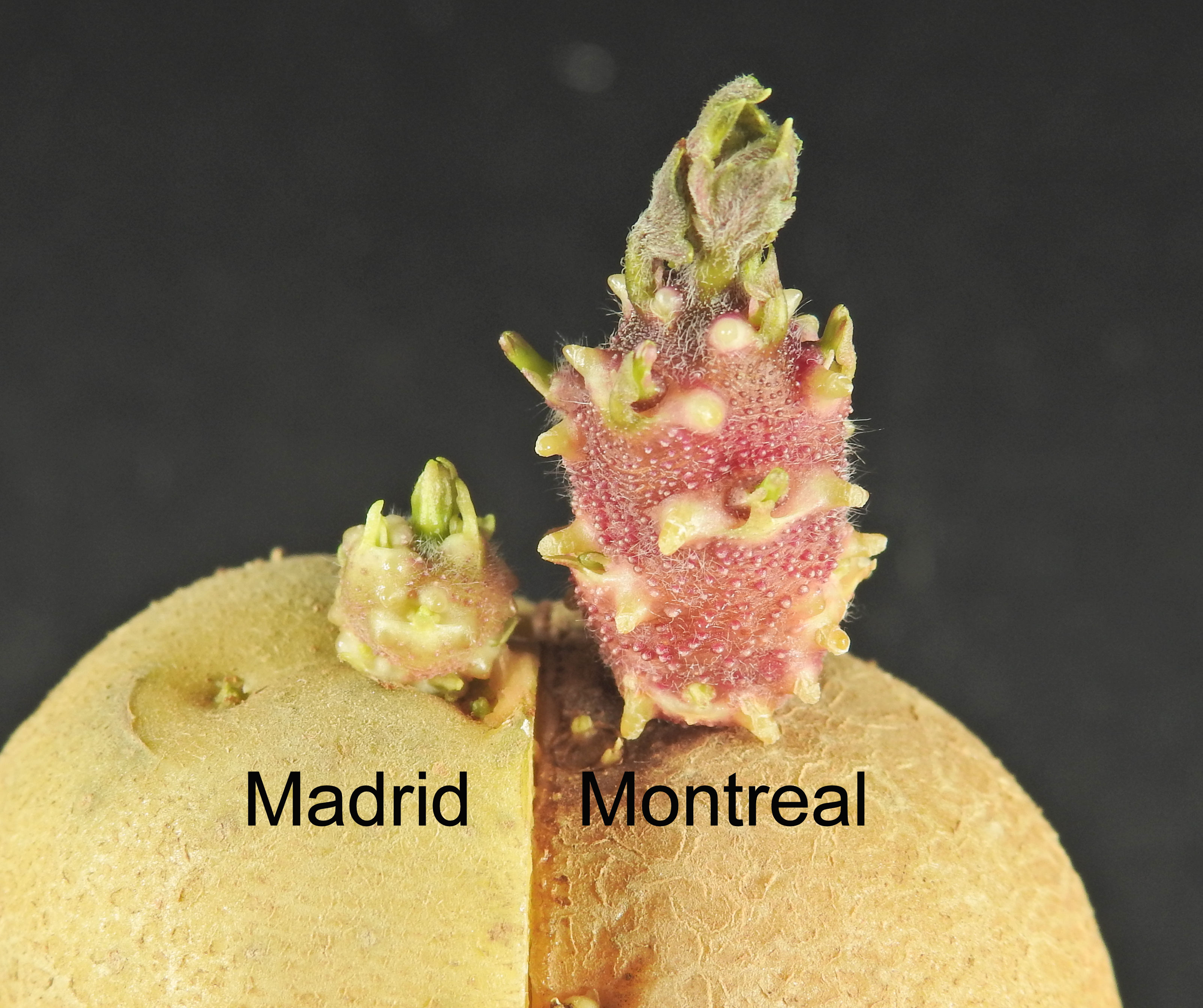 Summary: The lightsprout of Madrid' is small to medium in size while that of Montreal' is large. The base of the lightsprout of Madrid' is globose in shape and has a medium intensity of anthocyanin colouration while that of Montreal' is broad cylindrical and has a strong intensity of anthocyanin colouration. The apex of the lightsprout of Madrid' has a closed habit, a very weak to weak intensity of anthocyanin colouration, and absent or very sparse pubescence while that of Montreal' has an intermediate habit, a medium intensity of anthocyanin colouration, and medium to dense pubescence. The lightsprout of Madrid' has very few root tips while that of Montreal' has few root tips. The leaf of Madrid' is large to very large while that of Montreal' is medium sized. The flower bud of Madrid' has an absent or very weak intensity of anthocyanin colouration while that of Montreal' has a weak intensity of anthocyanin colouration. The plants of Madrid' are taller than those of Montreal'. The plants of Madrid' have a late to very late time of maturity while those of Montreal' have an early to mid-season time of maturity. The tuber flesh of Madrid' is light yellow while that of Montreal' is yellowish white.