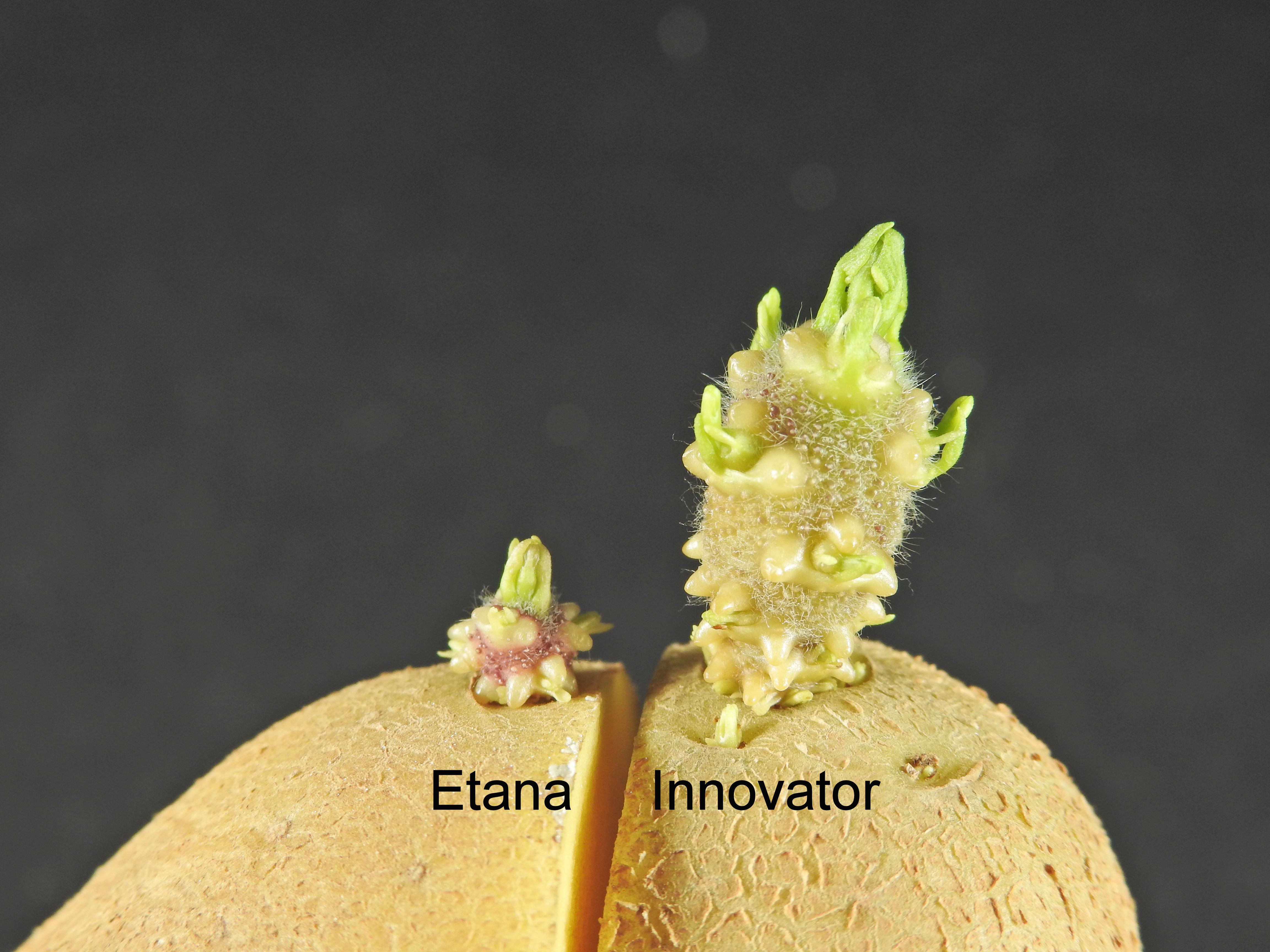 Summary: The lightsprout of Etana' is very small to small while that of Innovator' is large. The base of the lightsprout of Etana' is globose in shape and has a sparse to medium density of pubescence while that of Innovator' is broad cylindrical in shape and has medium to dense pubescence. The lightsprout apex of Etana' is medium sized in relation to the base while that of Innovator' is very small to small in relation to the base. The plants of Etana' have many to very many inflorescences and mid to late season time of maturity while those of Innovator' have few to a medium number of inflorescences and an early season time of maturity. The terminal and lateral leaflets of Etana' have an absent or very low frequency of coalescence while those of Innovator' have a high frequency of coalescence. The peduncle of Etana' has a medium extent of anthocyanin colouration while that of Innovator' has an absent or very low extent of anthocyanin colouration. The flower bud of Etana' has a medium intensity of anthocyanin colouration while that of Innovator' has an absent or very weak intensity of anthocyanin colouration. The inner side of the corolla of Etana' has a high extent of medium to strong intensity of anthocyanin colouration while that of Innovator' has an absent or very low extent of absent or very weak anthocyanin colouration. The tuber of Etana' has a medium texture of skin while that of Innovator' has a rough texture of skin.