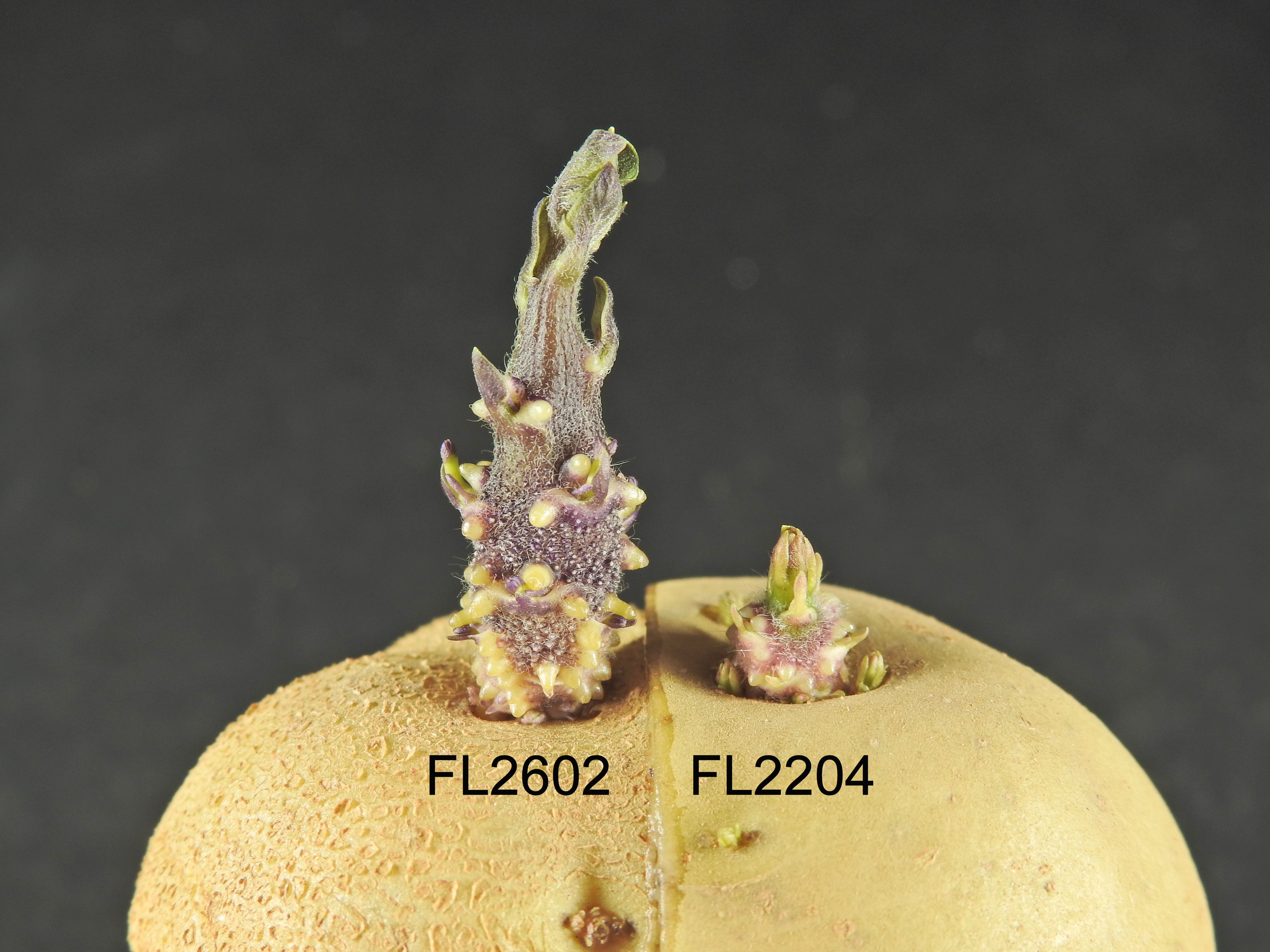 Summary: The lightsprout of FL2602' is very large and has a medium to high number of root tips while that of FL2204' is small to medium in size and has few root tips. The base of the lightsprout of FL2602' is narrow cylindrical, has a high proportion of blue in the anthocyanin colouration, and a sparse to medium density of pubescence while that of FL2204' is globose, has an absent or low proportion of blue in the anthocyanin colouration, and medium to dense pubescence. The apex of the lightsprout of FL2602' is small, has an intermediate habit and sparse to a medium density of pubescence while that of FL2204' is medium sized, has a closed habit, and very sparse to sparse pubescence. The stem of FL2602' has a medium to high extent of anthocyanin colouration while that of FL2204' has a very low to low extent of anthocyanin colouration. The upper side of the midrib on the leaf of FL2602' has a strong intensity of anthocyanin colouration while that of FL2204' has an absent or very weak intensity of anthocyanin colouration. The peduncle of FL2602' has a high extent of anthocyanin colouration while that of FL2204' has an absent or very low extent of anthocyanin colouration. The corolla of FL2602' has a large to very large diameter while that of FL2204' has a medium diameter. The tuber of FL2602' is round and has a medium skin texture while that of FL2204' has a short-oval form and smooth skin.