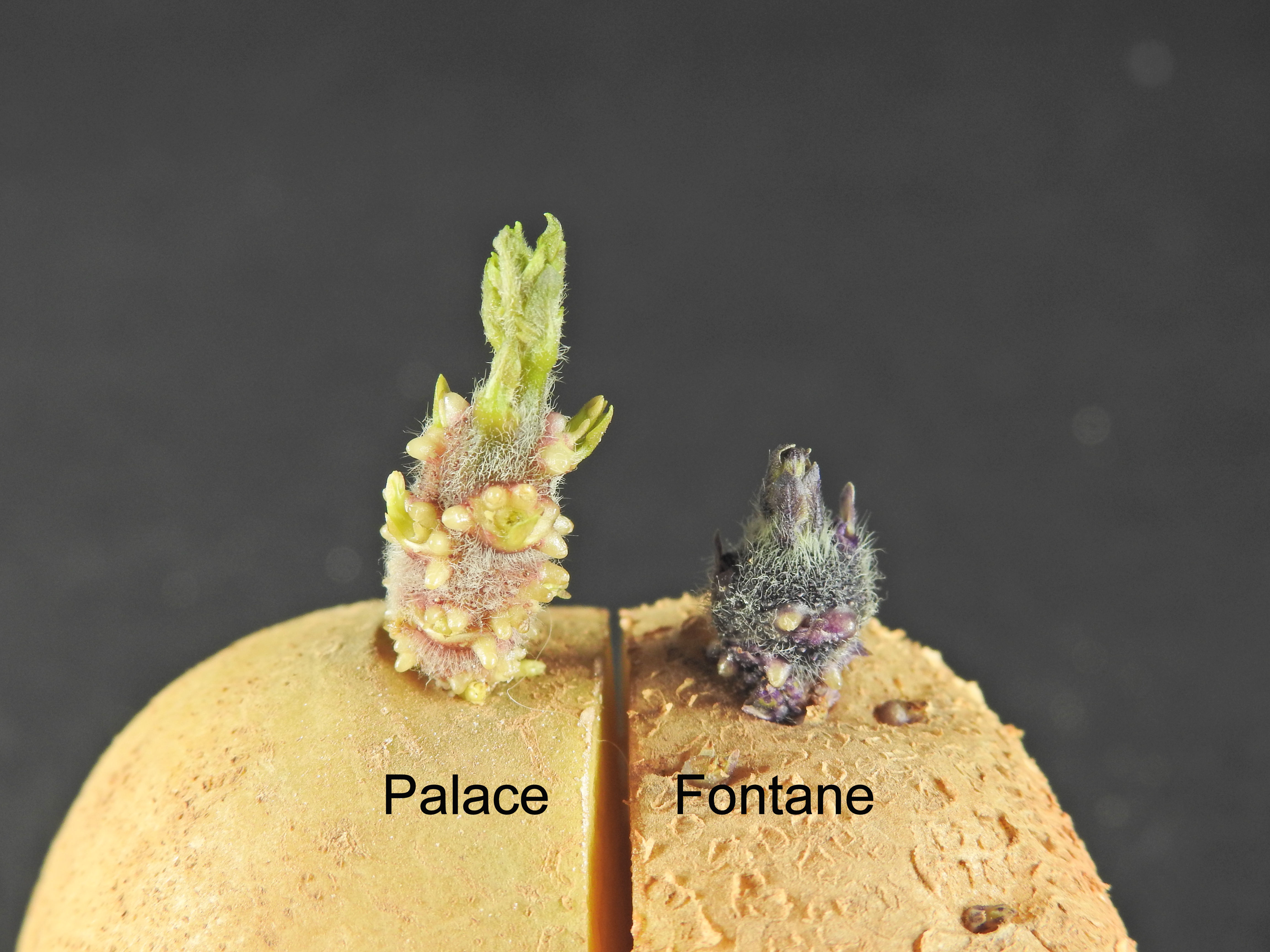 Summary: The lightsprout of Palace' is large, has medium to many root tips, and short lateral shoots while that of Fontane' is medium in size, has very few to few root tips, and very short lateral shoots. The base of the lightsprout of Palace' is broad cylindrical, has a strong intensity of anthocyanin colouration, and dense pubescence while that of Fontane' is globose, has a very strong intensity of anthocyanin colouration, and a medium density of pubescence. The apex of the lightsprout of Palace' has an intermediate habit, a weak intensity of anthocyanin colouration, and dense pubescence while that of Fontane' has a closed habit, a very strong intensity of anthocyanin colouration, and a sparse to medium density of pubescence. The plants of Palace' are taller than those of Fontane'. The stem of Palace' has a low extent of anthocyanin colouration while that of Fontane' has a high extent of anthocyanin colouration. The leaf of Palace' is large to very large with many secondary leaflets while that of Fontane' is medium in size with a medium number of secondary leaflets. The inner side of the corolla of Palace' has a very high extent of strong intensity anthocyanin colouration while that of Fontane' has an absent or very low extent of weak intensity anthocyanin colouration.