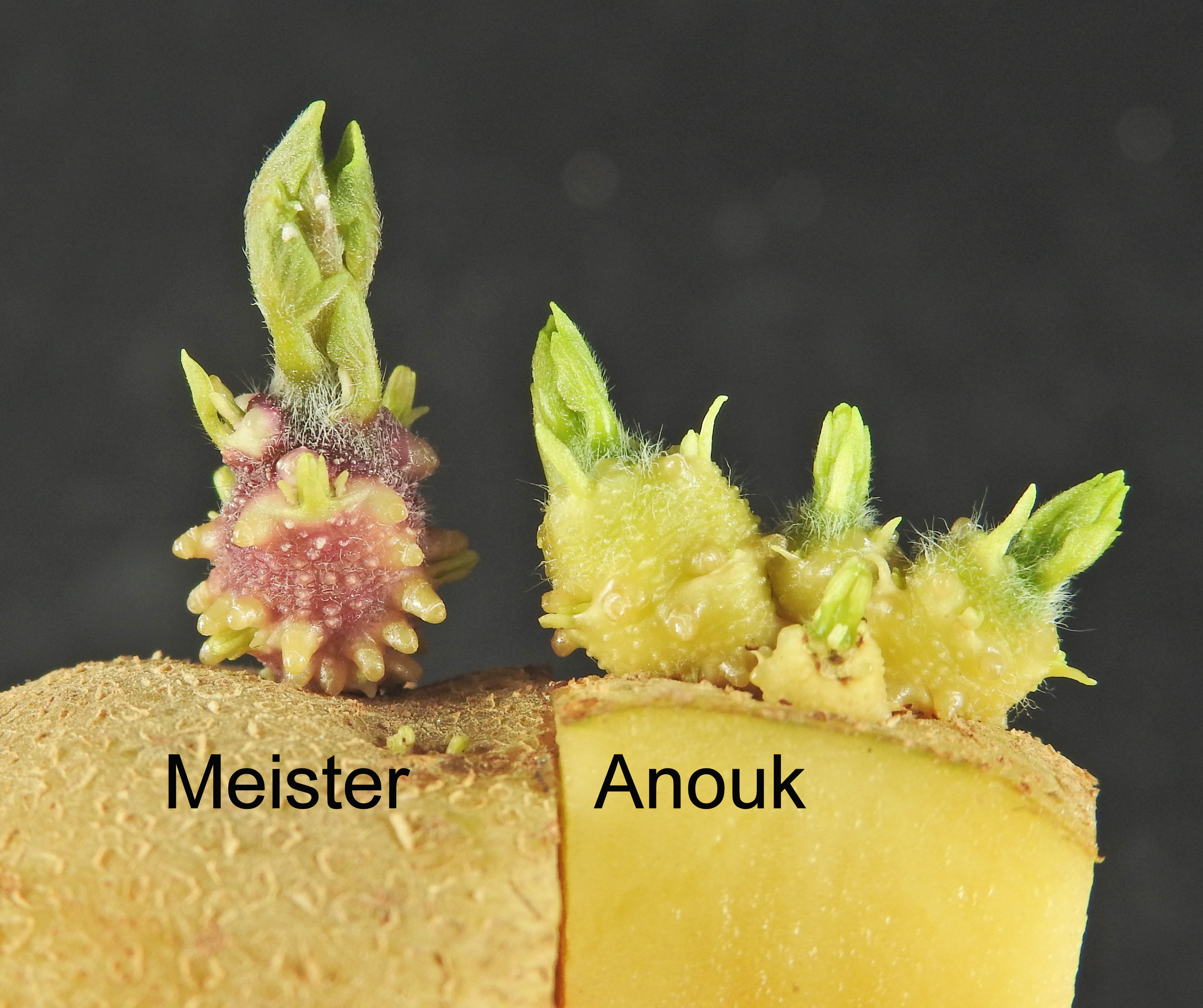Summary: The base of the lightsprout of Meister' has a medium to strong intensity of anthocyanin colouration while that of Anouk' has an absent or very weak intensity of anthocyanin colouration. The apex of the lightsprout of Meister' is medium to large in relation to the base and has an intermediate habit while that of Anouk' is small to medium sized in relation to the base and has a closed habit. The plants of Meister' are taller than those of Anouk'. The plants of Meister' have many inflorescences while those of Anouk' have a medium number of inflorescences. The stem of Meister' has a low extent of anthocyanin colouration while that of Anouk' has an absent or very low extent of anthocyanin colouration. The leaf of Meister' has a touching arrangement of leaflets while that of Anouk' has a free arrangement of leaflets. The tuber of Meister' is oval to long-oval in form and has white flesh while that of Anouk' is round to short-oval in form and has medium yellow flesh.