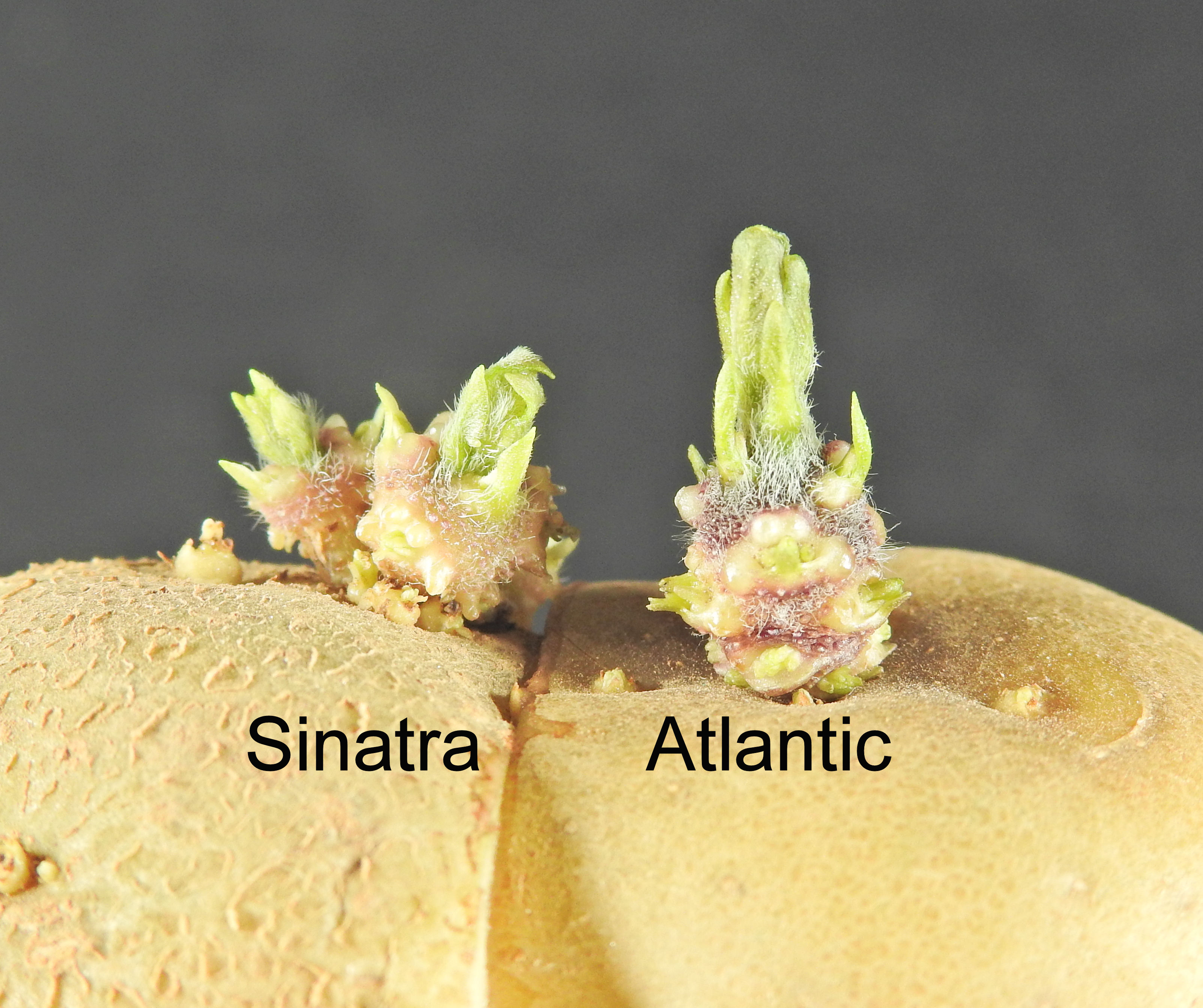 Summary: The lightsprout of Sinatra' is small while that of Atlantic' is medium sized. The base of the lightsprout of Sinatra' has a medium intensity of anthocyanin colouration and a sparse to medium density of pubescence while that of Atlantic' has a strong intensity of anthocyanin colouration and medium to dense pubescence. The plants of Sinatra' are taller than those of Atlantic'. The plants of Sinatra' have many to very many inflorescences, and mature late in the season while those of Atlantic' have few to a medium number of inflorescences, and mature mid-season. The leaf of Sinatra' is small to medium in size with very few to few secondary leaflets while that of Atlantic' is large with a medium number of secondary leaflets. The flower bud of Sinatra' has an absent or very weak intensity of anthocyanin colouration while that of Atlantic' has a strong intensity of anthocyanin colouration. The inner side of the corolla of Sinatra' has an absent or very low extent of absent or very weak intensity anthocyanin colouration while that of Atlantic' has a high extent of medium intensity anthocyanin colouration. The tuber of Sinatra' has a shallow depth of eyes while that of Atlantic' has a medium depth of eyes.
