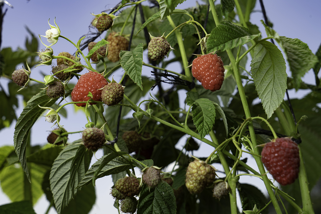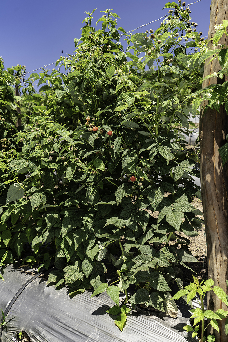 FRUIT: long, medium to broad, large length to width ratio, conical in lateral view, medium red, medium to strong glossiness, firm, medium adherence to plug, begins ripening mid to late season on previous year's cane, begins ripening mid-season on current season's cane, short to medium fruiting period on previous year's cane, long to very long fruiting period on current season's cane