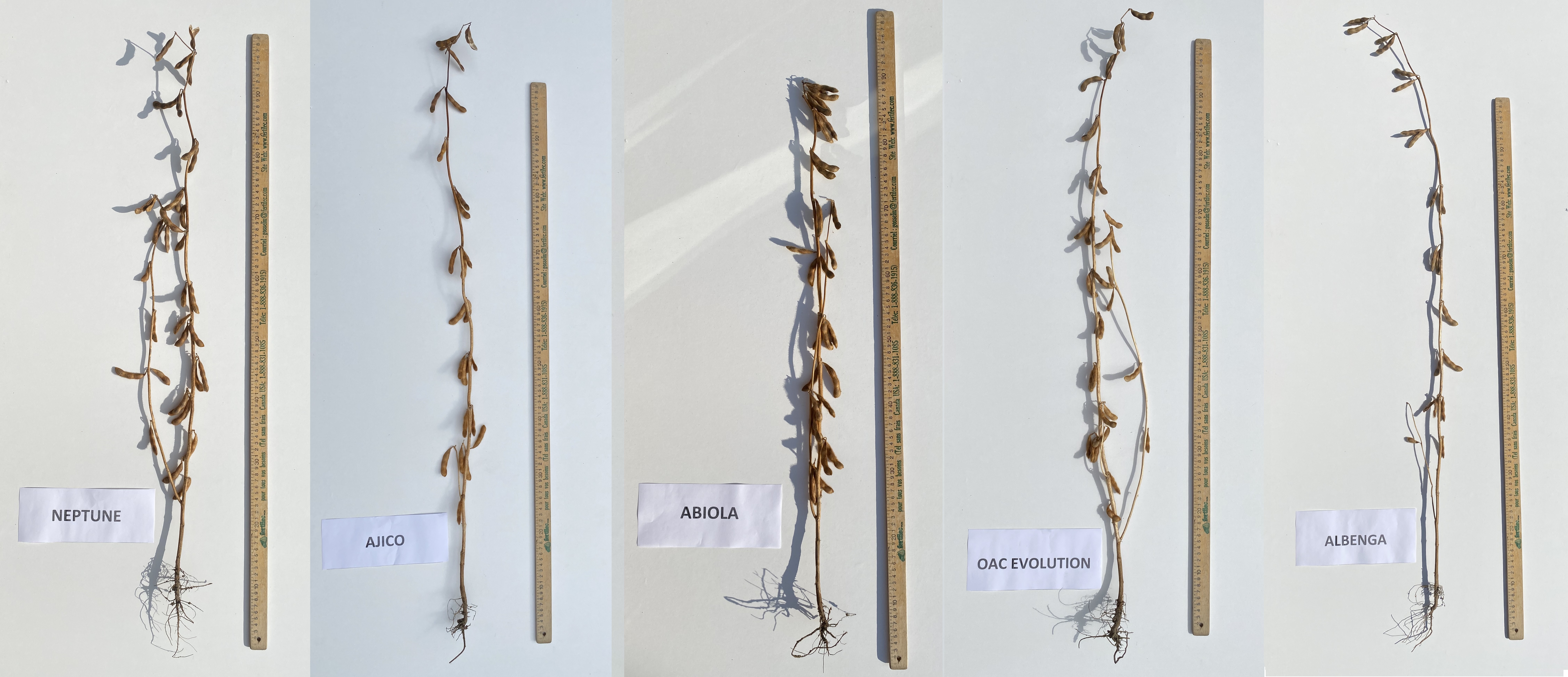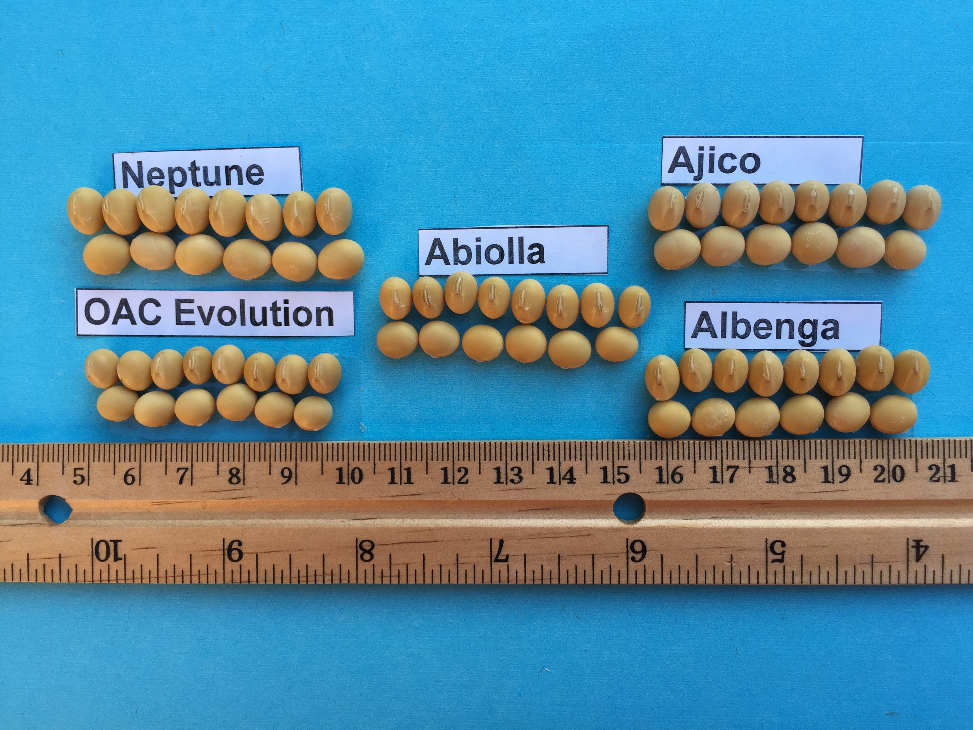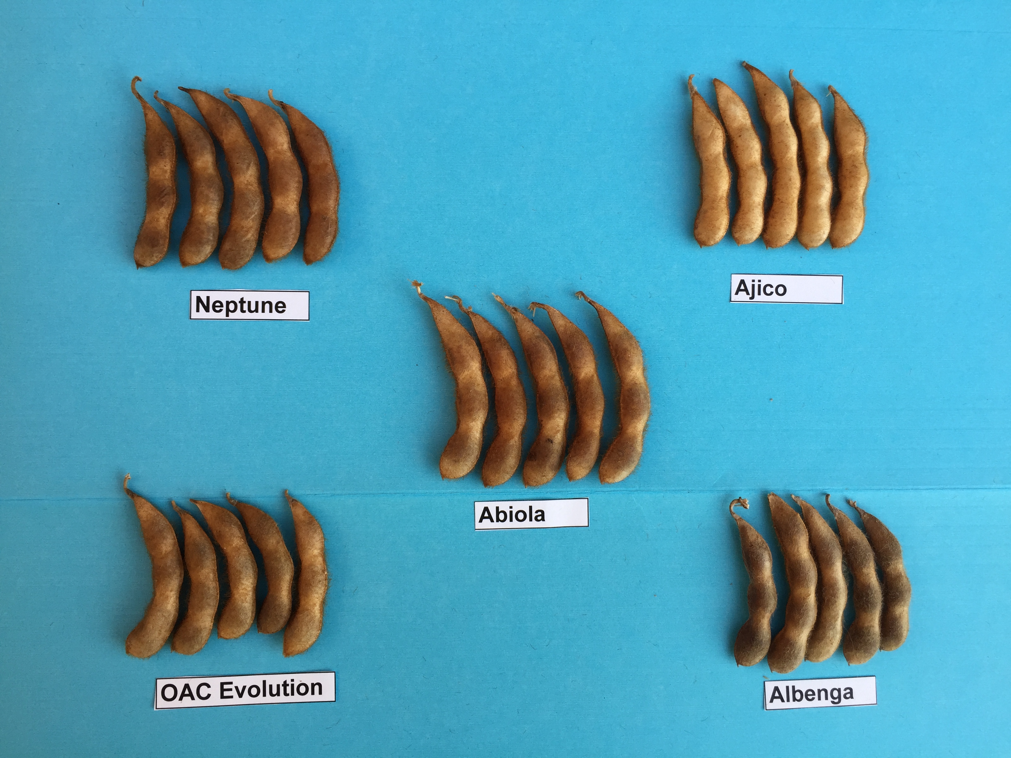 Soybean: 'Abiola' (centre) with reference varieties 'Neptune' (far left), 'Ajico' (left), 'OAC Evolution' (right) and 'Albenga' (far right)