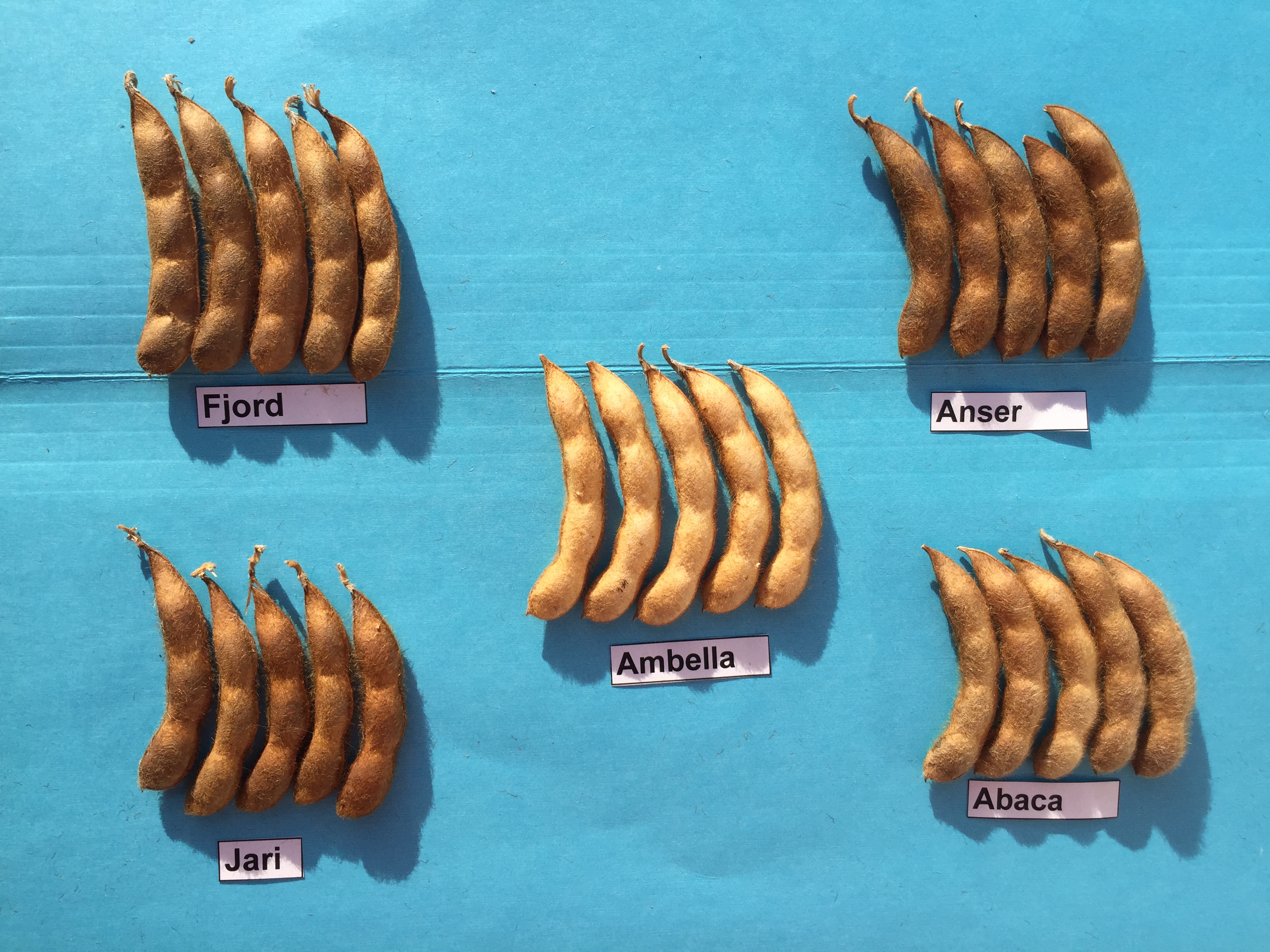 Soybean: 'Ambella' (centre) with reference varieties 'Fjord' (top left), 'Anser' (top right), 'Abaca' (bottom right) and 'Jari' (bottom left)