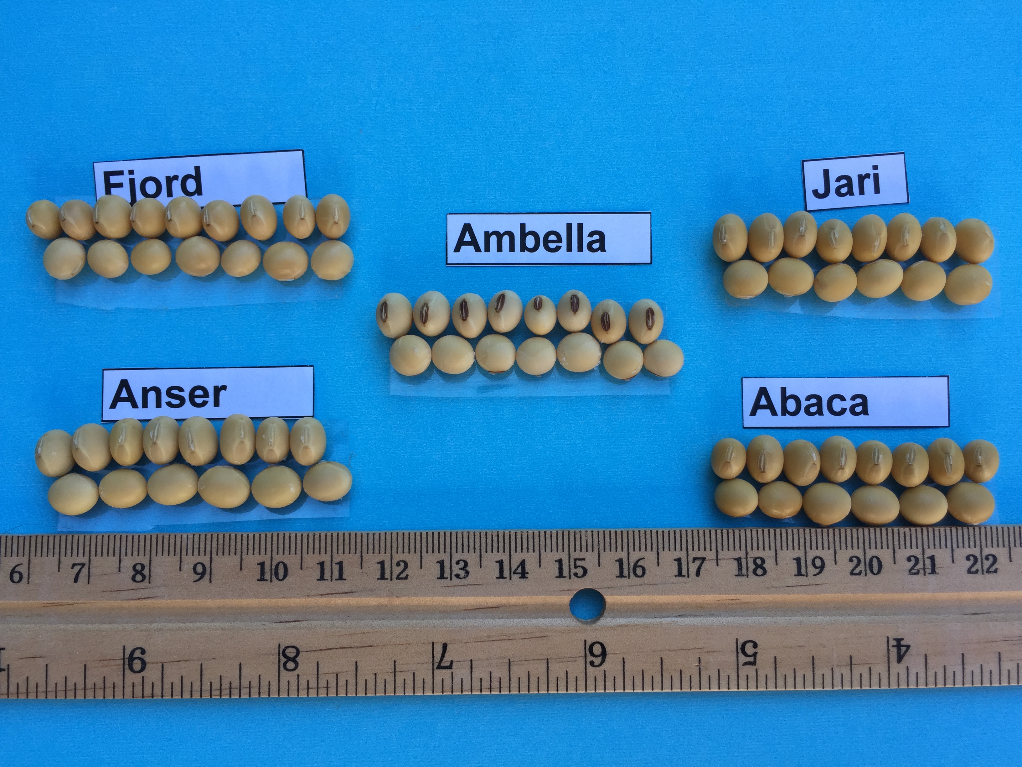 Soybean: 'Ambella' (centre) with reference varieties 'Abaca' (far left), 'Jari' (left), 'Fjord' (right) and 'Anser' (far right)