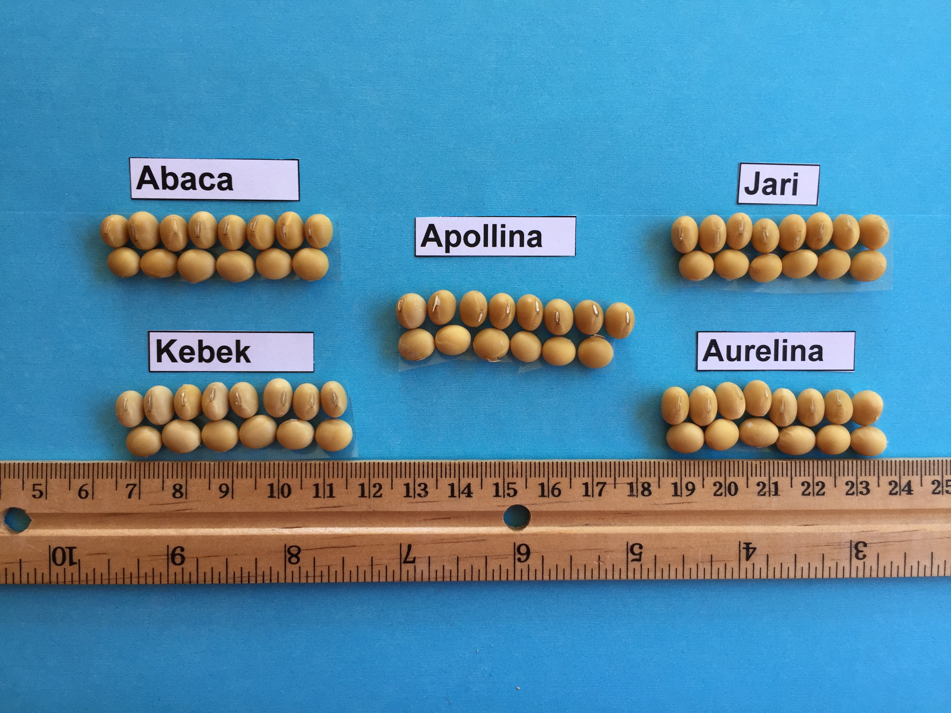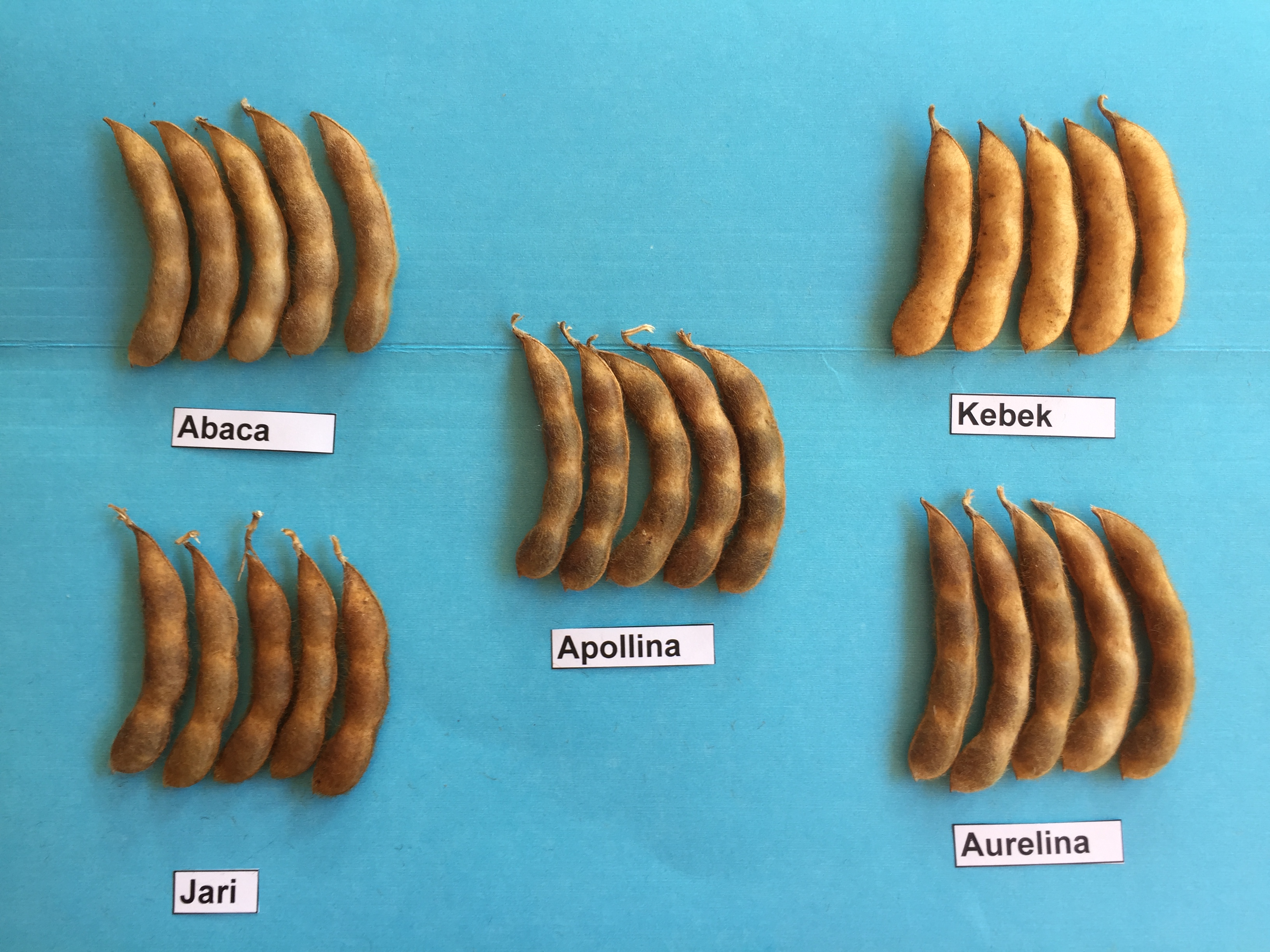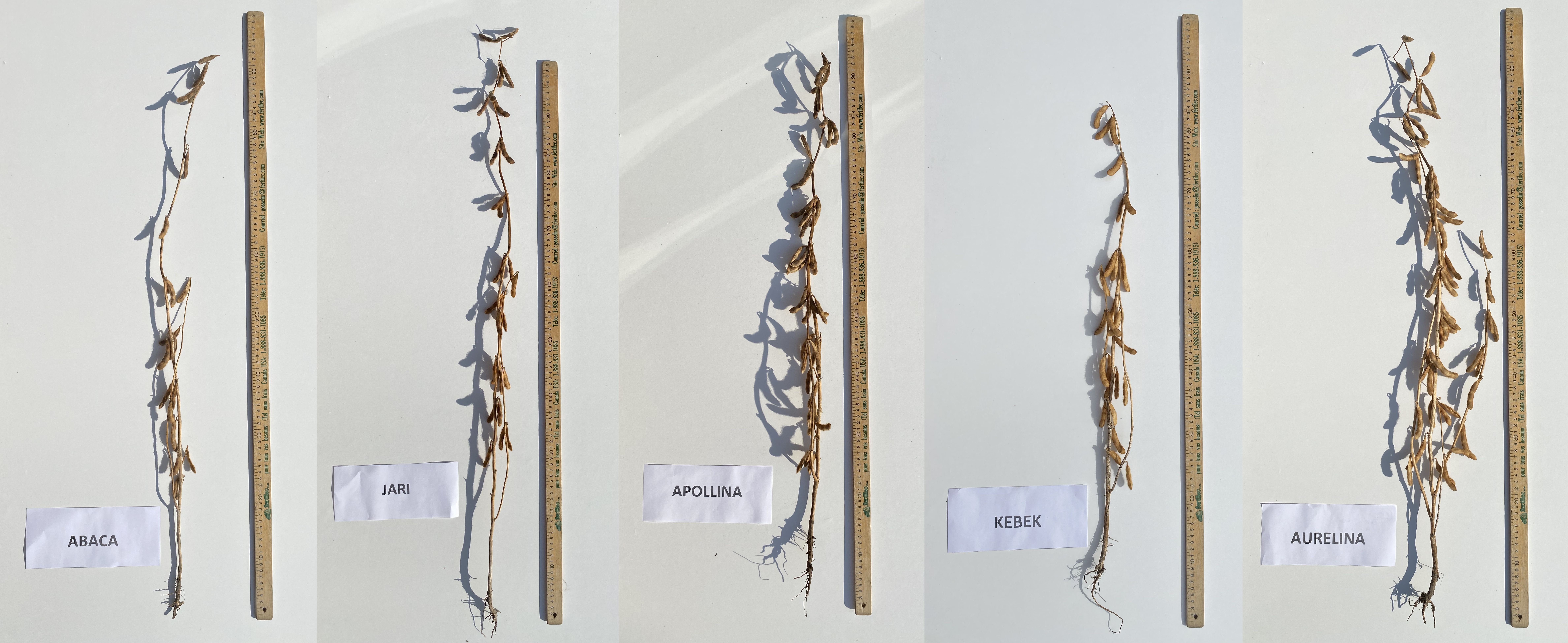 Soybean: 'Apollina' (centre) with reference varieties 'Abaca' (far left), 'Jari' (left), 'Kebek' (right) and 'Aurelina' (far right)
