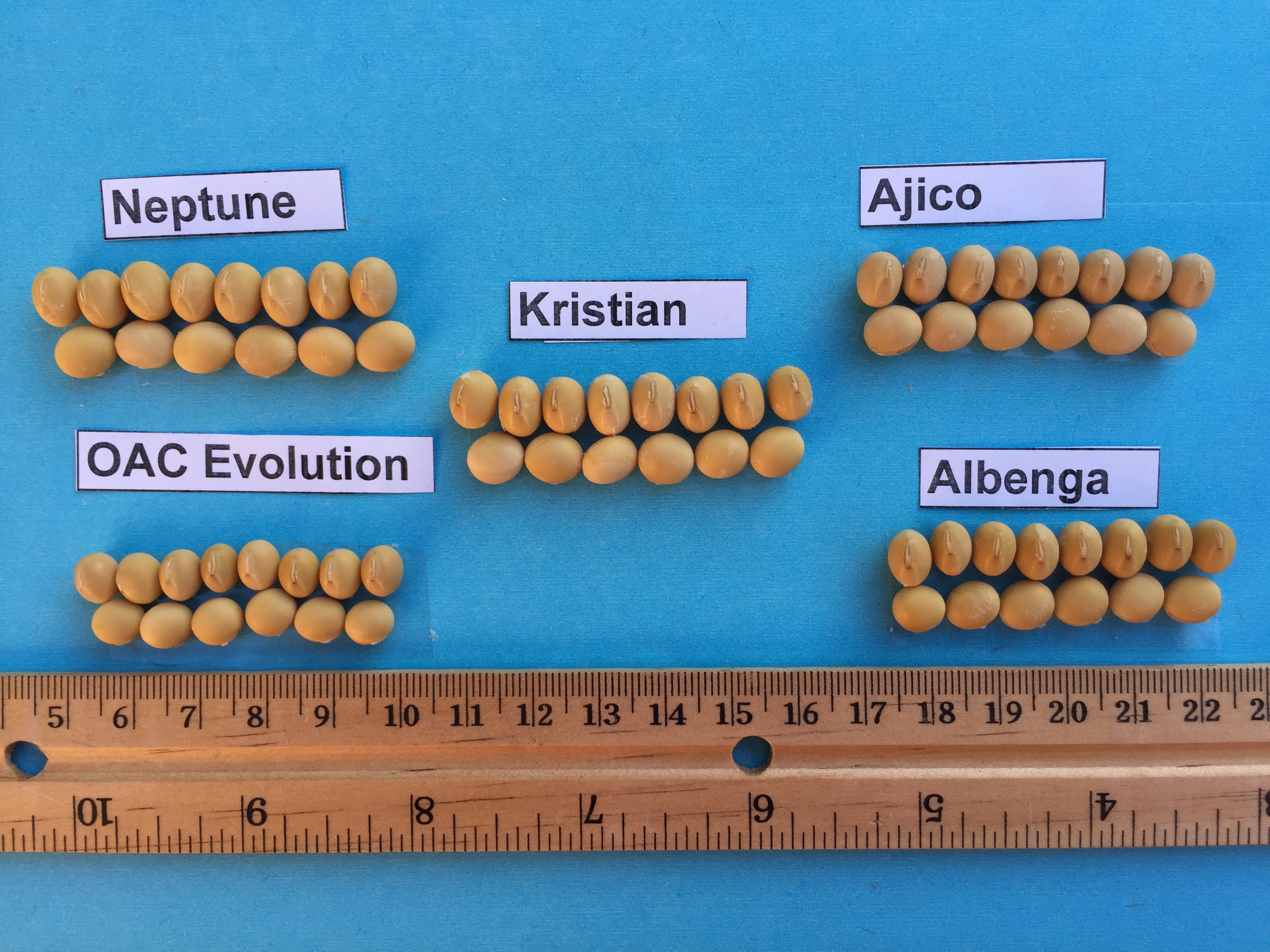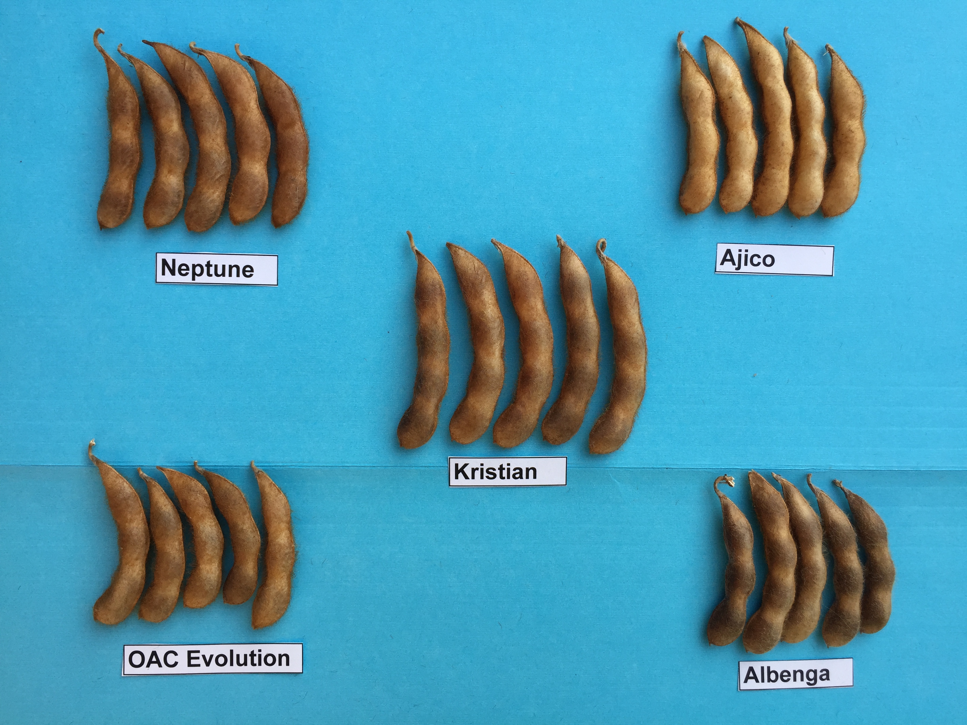 Soybean: 'Kristian' (centre) with reference varieties 'Neptune' (top left), 'Ajico' (top right), 'Albenga' (bottom right) and 'OAC Evolution' (bottom left)