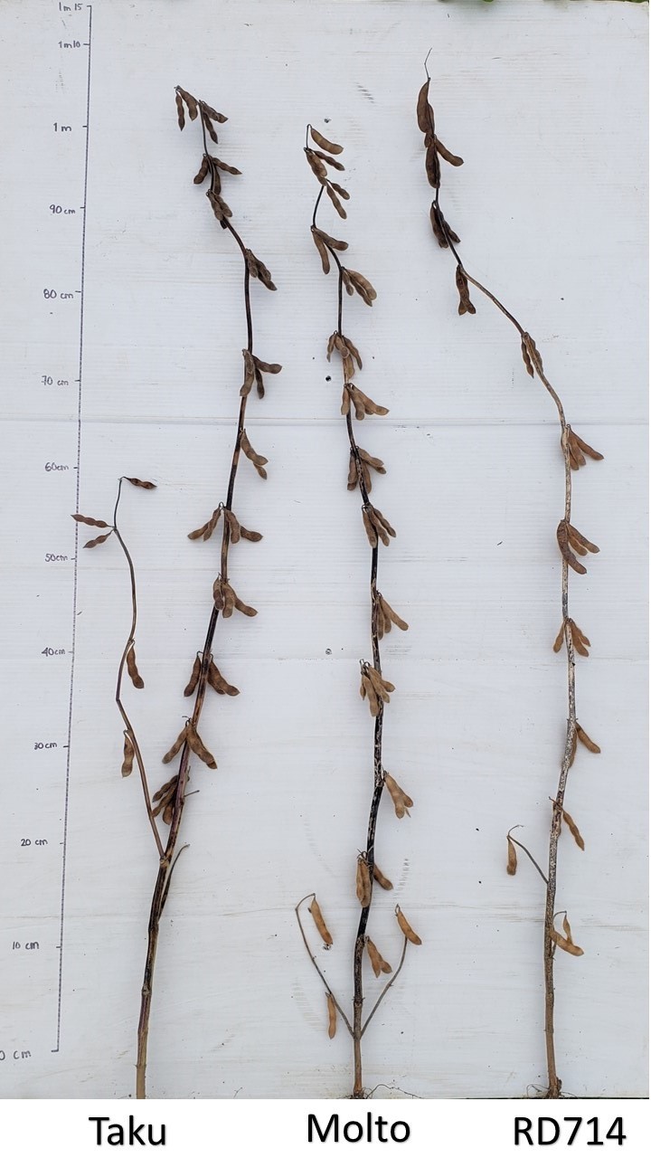Soybean: 'Molto' (centre) with reference varieties 'Taku' (left) and 'RD714' (right).