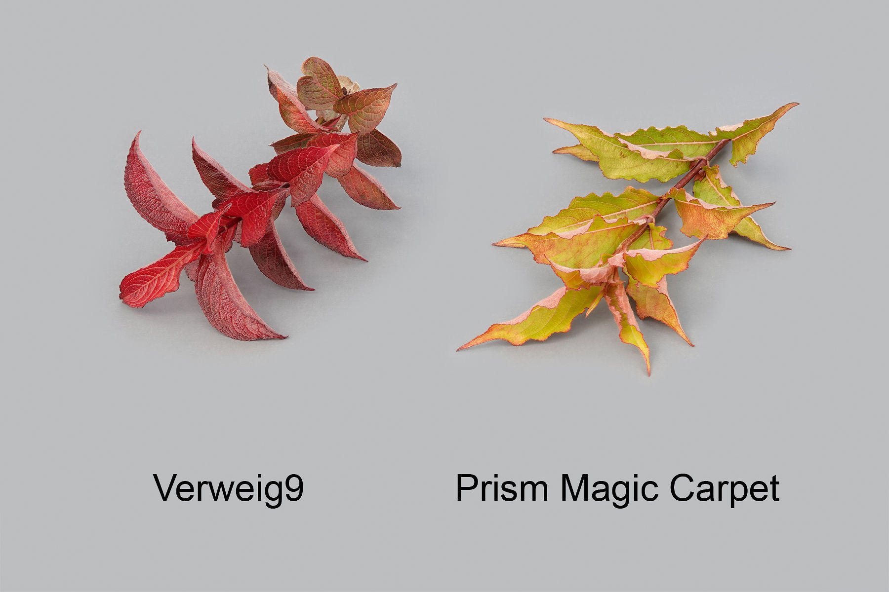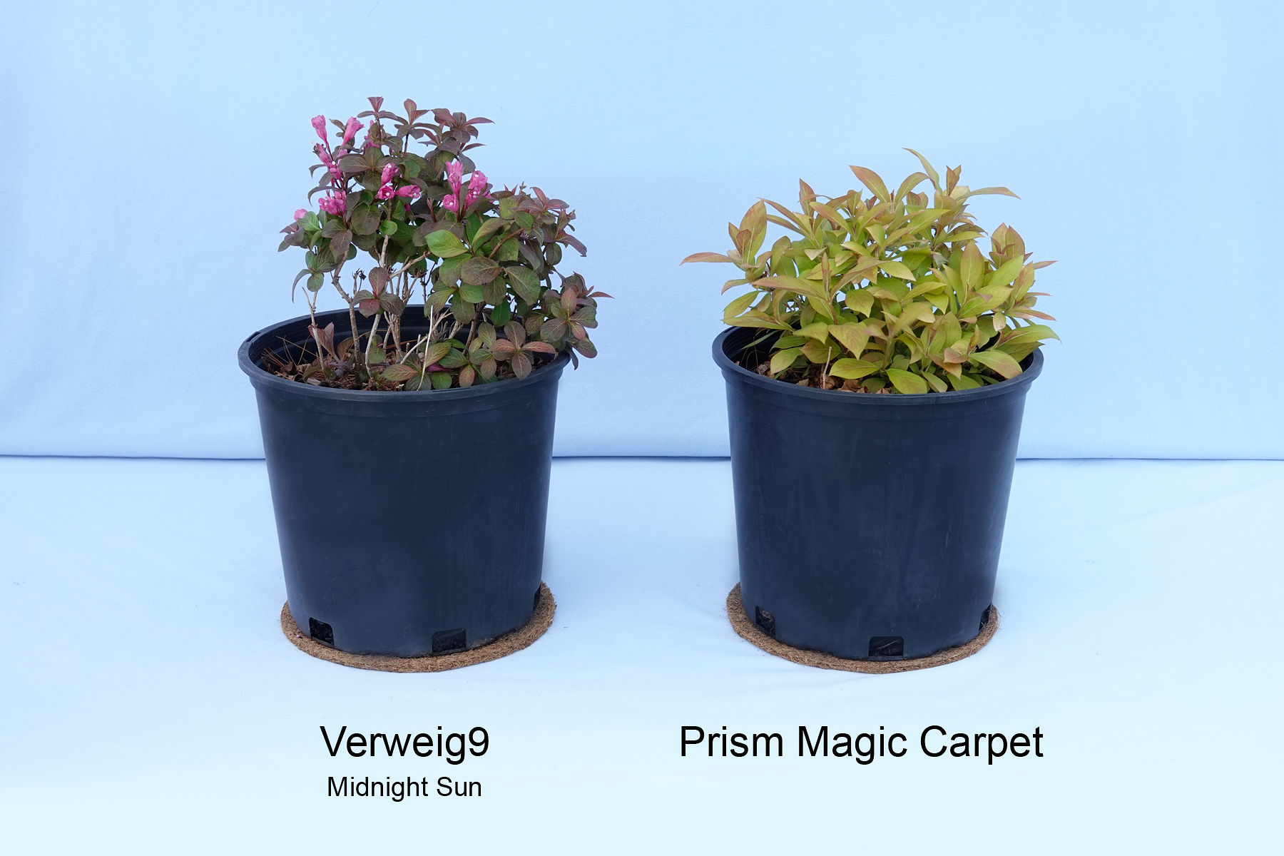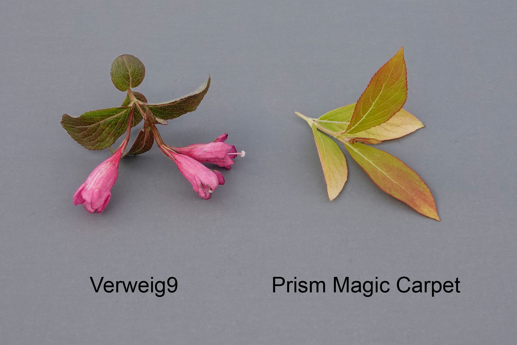 Weigela: 'Verweig9' (left) with reference variety 'Prism Magic Carpet' (right)