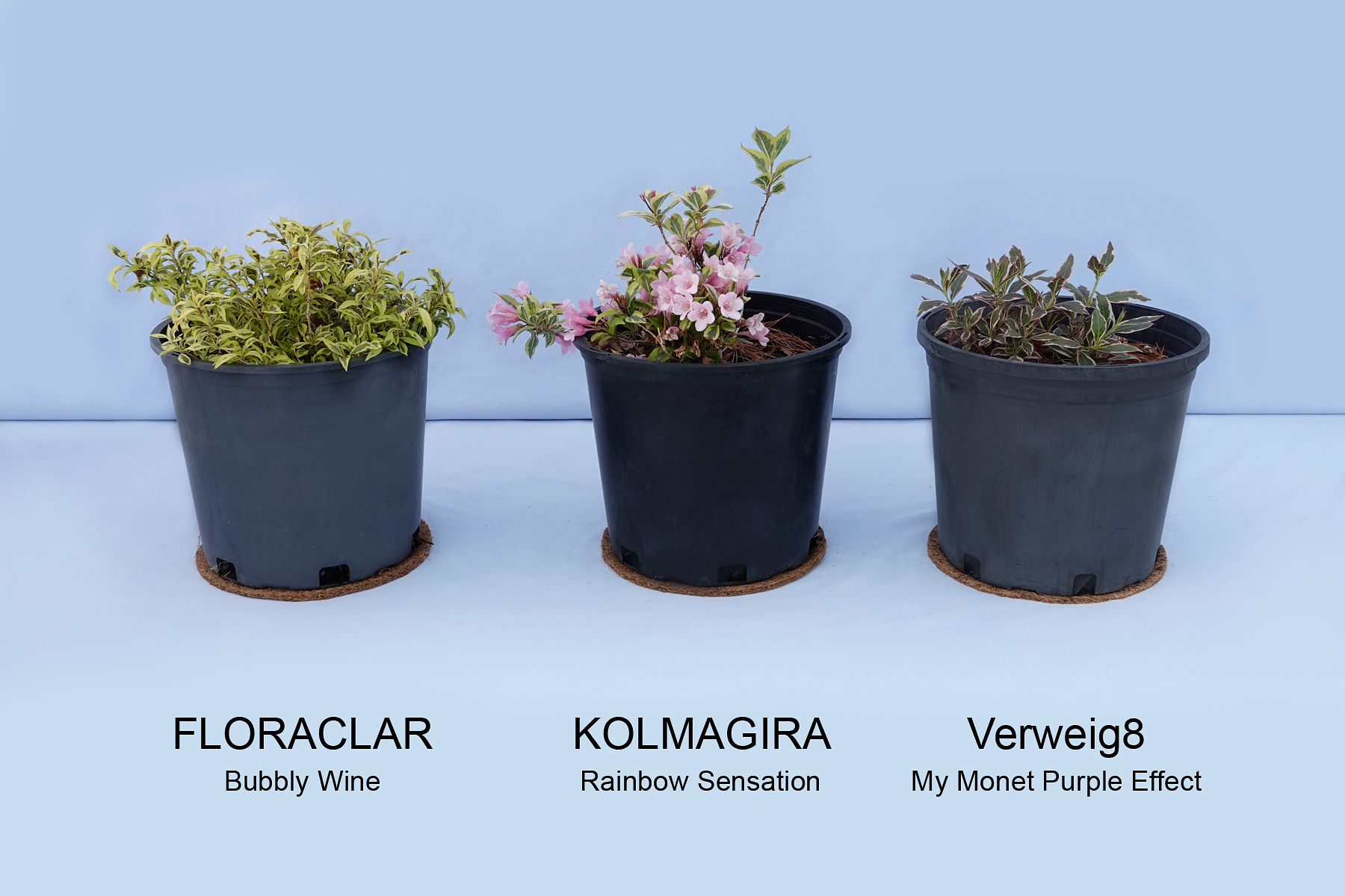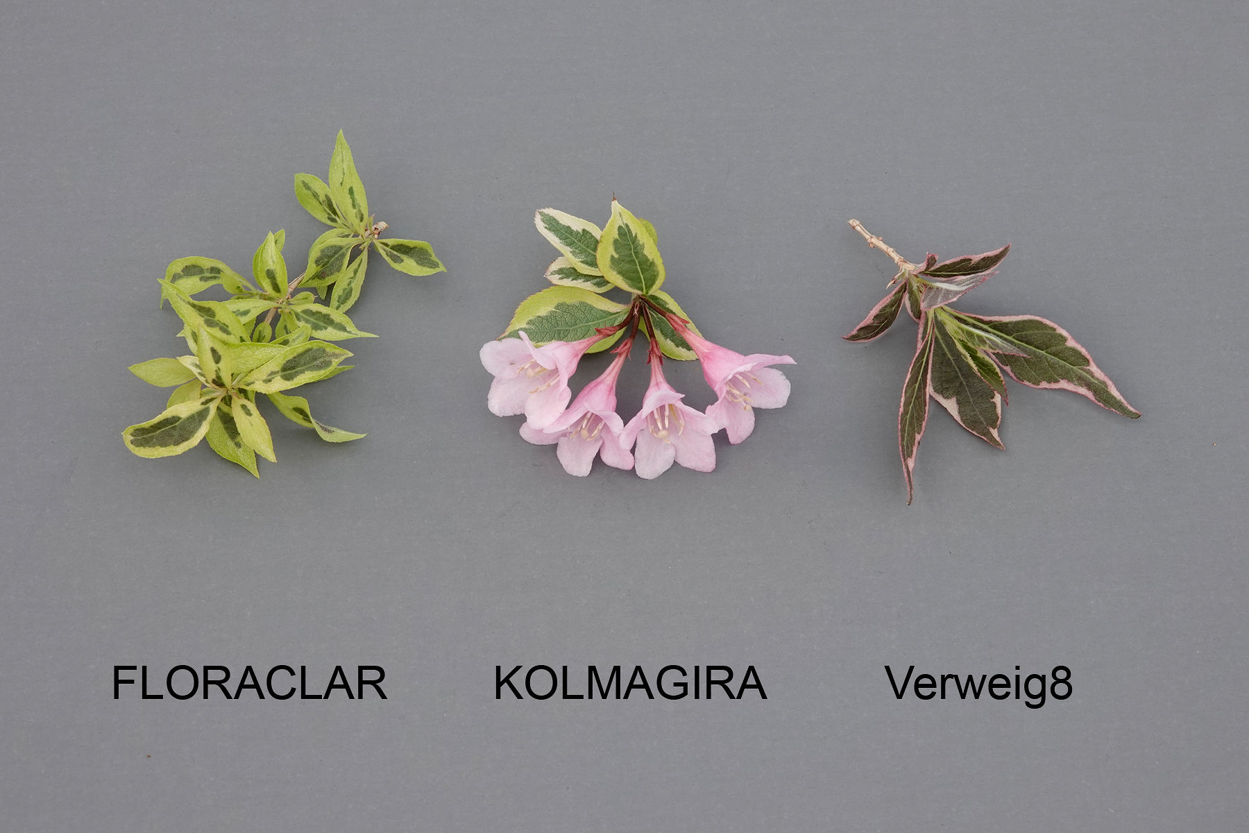 Weigela: 'FLORACLAR' (left) with reference varieties 'Kolmagira' (center) and 'Verweig8' (right)