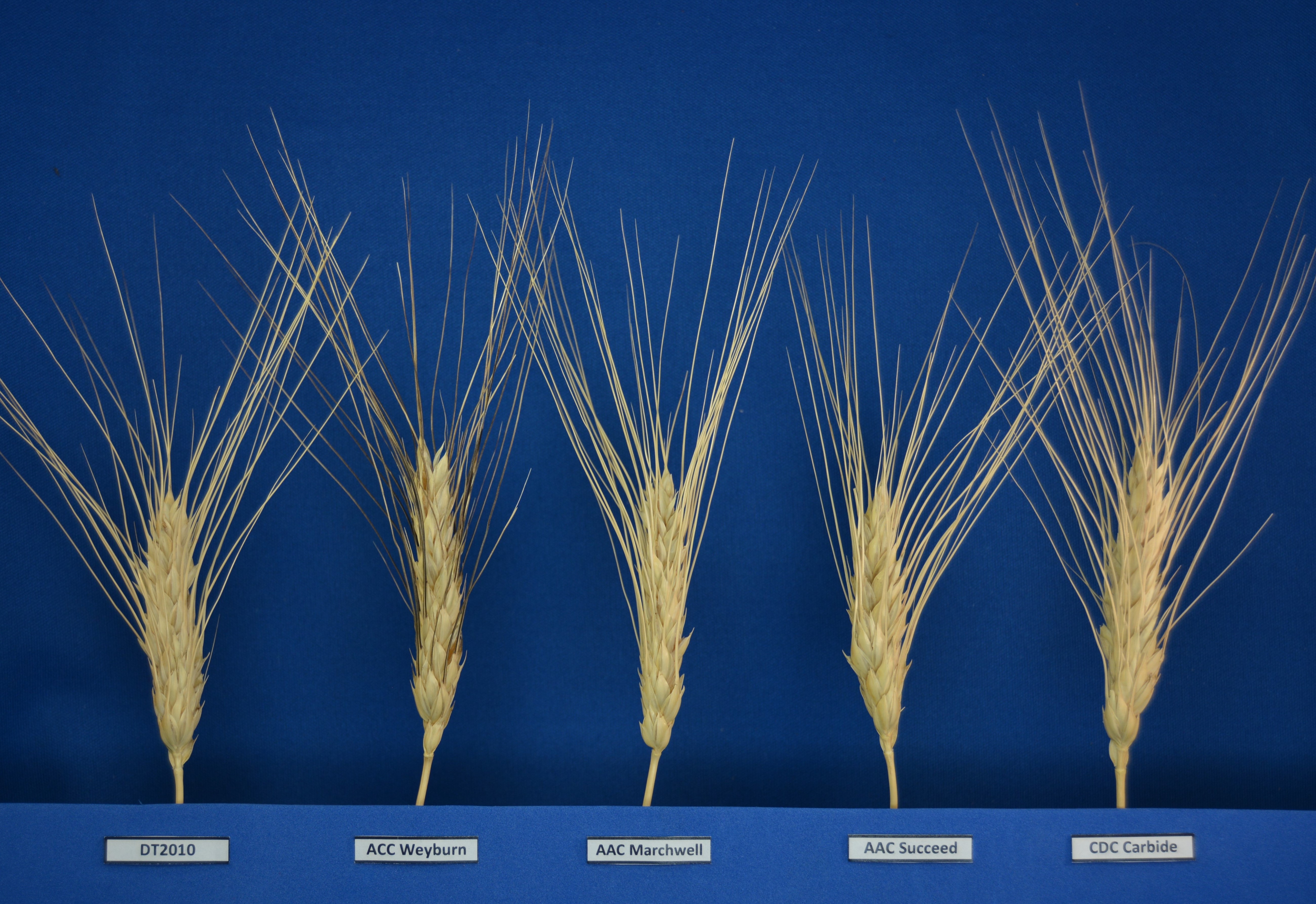 Wheat: AAC Brigham' (left) with reference varieties AAC Weyburn' (centre left), AAC Marchwell' (centre), AAC Succeed' (centre right) and CDC Carbide' (right)
