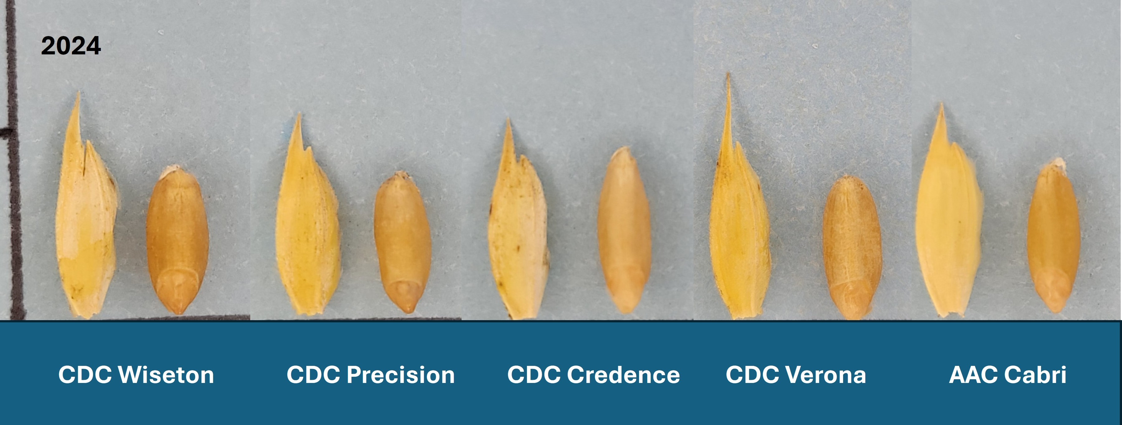 Wheat: 'CDC Wiseton' (left) with reference varieties 'CDC Precision' (centre left), 'CDC Credence' (centre), 'CDC Verona' (centre right) and 'AAC Cabri' (right)